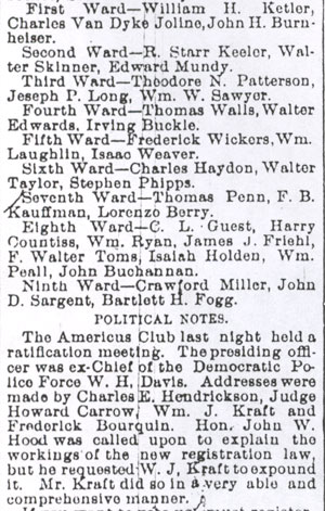 Miller Frank T. Lloyd - Charles V.D. Joline Frederick A. Rex - William F. Rex Robert F. Miller - Albert Keaser George V. Murry - John Morrisey Harry Selby - William H. Selby Dr. George D. Grimes - William Laws John Cherry - John S. Smith Charles Cahill - Edward Hartman Owen McDonald - John Helm Albert Keaser - F. Morse Archer John Wagner - John C. Truitt Anna Hutner - William Ridgway Ogden |