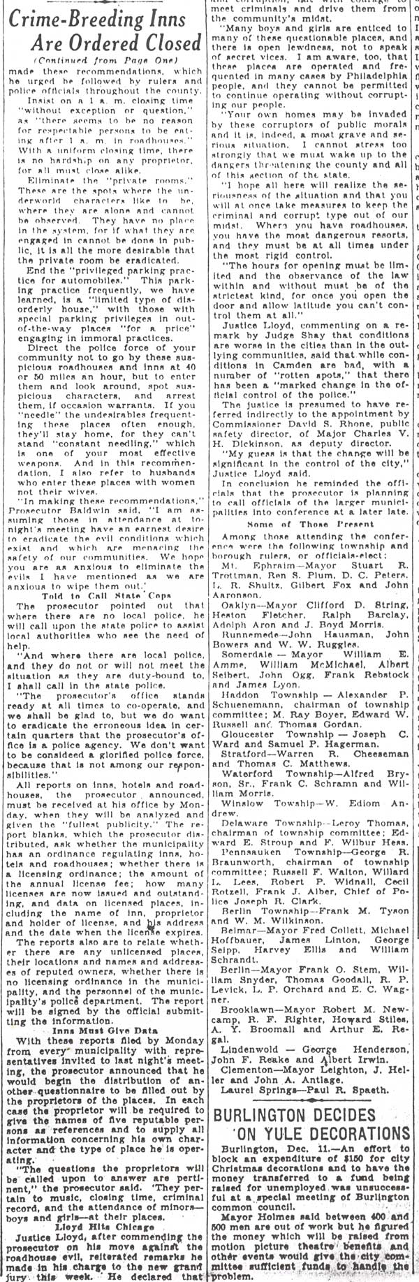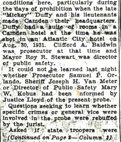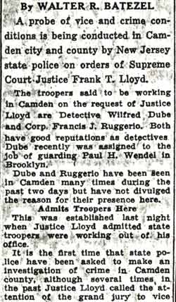 When the faithful and loyal threw that birthday party to Harold Hoffman in New York the other night, Paul Wendel happened to be in the same hotel...They didn't meet...The "numbers raid" in Merchantville is another attribute to Chief Bill Linderman and his on-the-toes police department.. The irony of it, however, can't pass notice...The pinch was made within a few blocks of Justice Lloyd, who before his recent retirement caustically criticized numbers and other gambling racket elsewhere... |