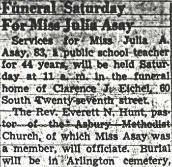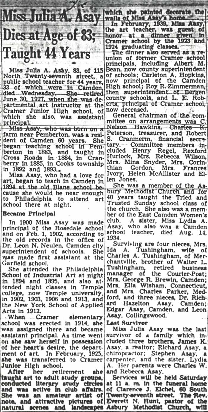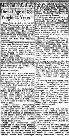 JULIA A. ASAY was born on a farm in Pemberton NJ to Charles and Rebecca Asay around 1866. A public school teacher for 44 years, she began teaching Camden in 1894, and remained with the school system until she retired in 1927. She taught at the Blaine, Rosedale, and Garfield Schools, and in 1914, she was made vice-principal of the then just-opened Cramer School. She was the first ever vice-principal of that school, which was short walk from her home at 115 North 27th Street. Julia Asay's sister, Lydia A. Asay, also taught in the Camden school system. neither sister ever wed. A long-time member of Asbury Methodist Church, Miss Julia Asay passed away on April 19, 1950. She was buried at Arlington Cemetery in Pennsauken NJ. |
