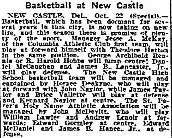 KENNARD HAWORTH NAYLOR was born in Wilmington, Delaware on November 5, 1892 to Edward and Mary Naylor. He grew up in New Castle, Delaware where he attended New Castle High School and played basketball alongside his brother John. During World War I Kennard Naylor served in the United States Navy. He married Harriet Barnes on June 7, 1918. He was still married when the Census was taken in 1920, however by 1924 he appears to have been living on his own.