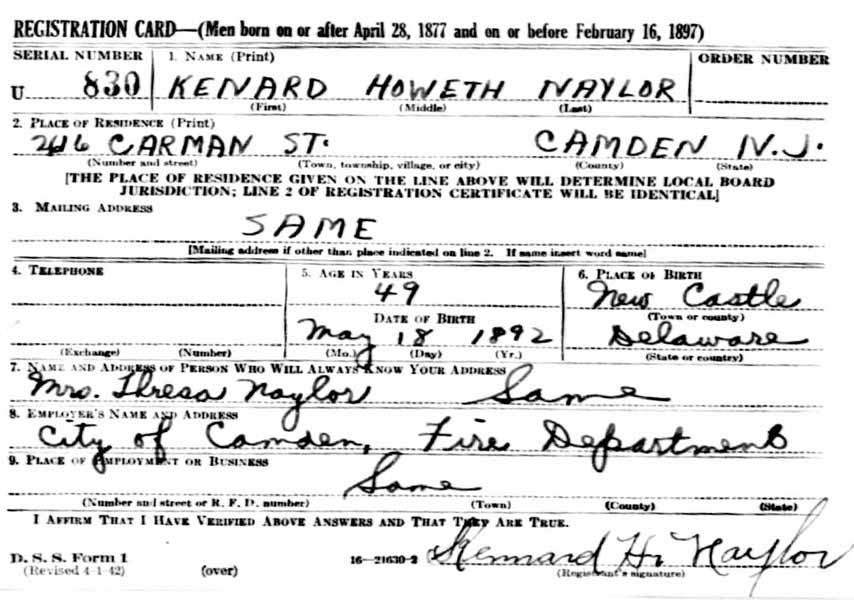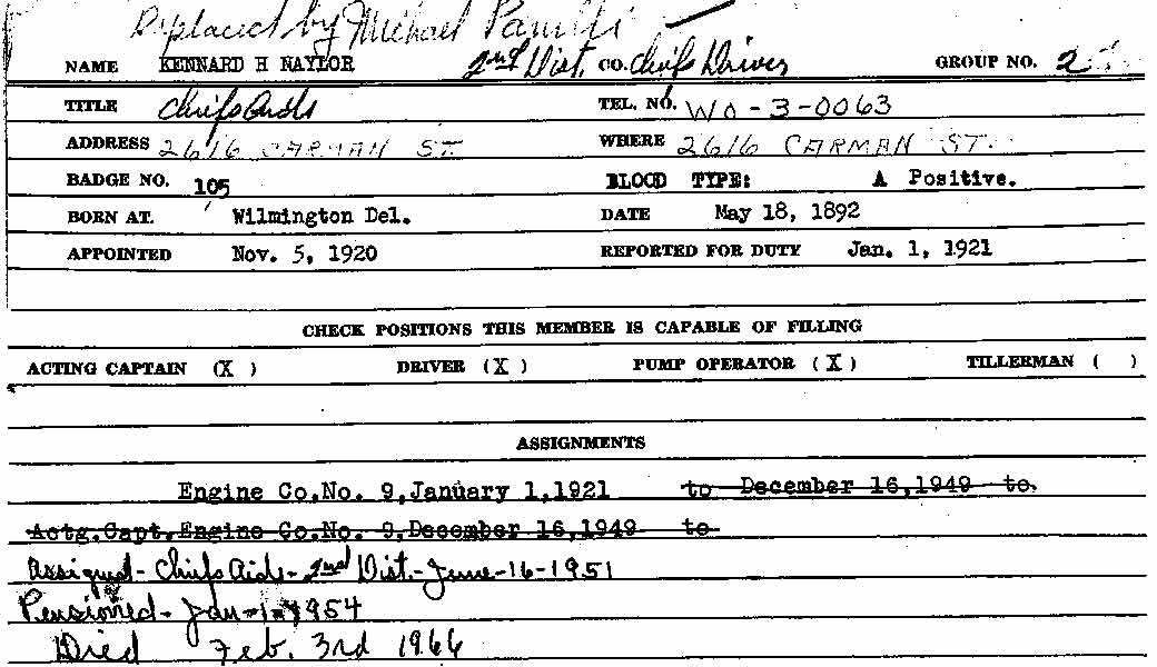 The USS Hopewell, a 1090-ton Lamberton class destroyer, was built at Newport News, Virginia, under the World War I emergency shipbuilding program. She was commissioned in mid-March 1919, about five months after the conflict's end, and in May helped support the trans-Atlantic flight of the seaplane NC-4. Thereafter operated in the western Atlantic and Caribbean areas, with her duties including training Naval reservists during 1920 and 1921. Kennard Naylor was discharged from the United States Navy in 1920 and came to Camden, New Jersey where he may have had some family connections. Kennard Naylor was appointed to the Camden Fire Department on November 5, 1920. He reported for duty January 1, 1921 with Engine Company 9 in East Camden. He was assigned to the position of Second District's Chief's Aide on June 16, 1951. He retired on pension on January 1, 1954. The 1924 Camden City Directory shows Kennard Naylor living at 952 Linden Street. He was still there when the 1927 City Directory was compiled. By 1929 Kennard H. Naylor was boarding at 334 North 10th Street, and he was still there when the census was taken in April of 1930. He married during the 1930s. The 1940 Camden City Directory shows him living at 2616 Carman Street. Kennard Naylor passed away on February 3, 1966. They Naylor family was still living at 2616 Carman Street as late as the fall of 1977. |