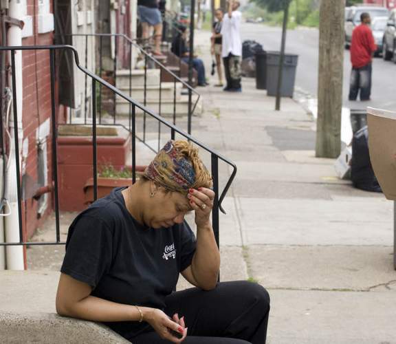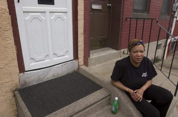 Juanita Wiggins, 43, sits outside her Sycamore Street home in Camden. Her husband Kevin Wiggins, 49, was murdered early Thursday morning on the corner of the block.