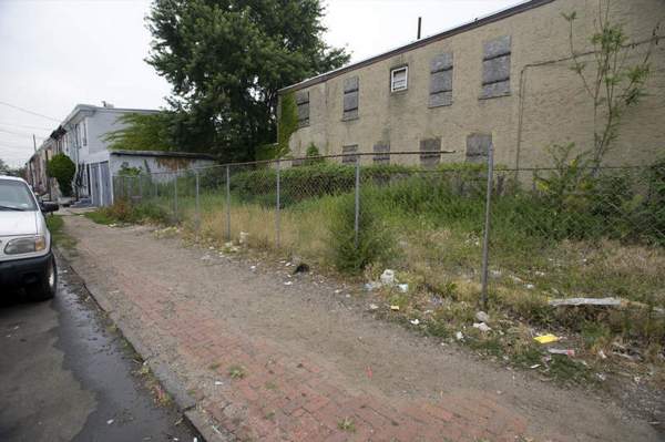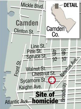 View of the northwest corner of 4th and Sycamore Streets in Camden where Kevin Wiggins, 49, was murdered. Building at right of photo fronts on South 4th Street. |