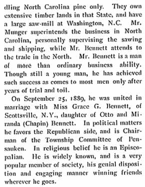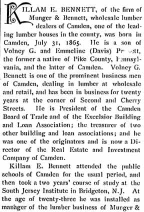 KILLAM EDGAR BENNETT was born on July 31, 1865 in Camden NJ, the eldest child of Volney G. and Emmeline Bennett. His father, Volney Bennett Sr., operated a large lumber business in Camden with George A. Munger. After completing his education at the age of 23, Killam Bennett joined the business, and succeeded George A. Munger as a member of the firm. His brother, Volney Bennett Jr. also took part in the business. Killam Bennett's early years were spent at 310 North 6th Street in Camden. After his marriage in September of 1889 to Grace Bennett, of Scottsville NY, Killam Bennett moved to "River avenue near Cooper avenue, n Cramer's Hill" according to the 1890-1891 Camden City Directory. Killam E. Bennett also was involved, along with William L. Hurley, George A. Munger, and Volney G. Bennett, in the incorporation of the Central Trust Company. This bank built a large building at 401 Federal Street, which is still standing. The bank advertised as "the most acceptable small bank known", catering to "women's accounts", and kept Saturday evening hours for workers unable to bank during the week. He was a member of the Camden Club, the Camden Rotary Club, and was past president of the Camden Chamber of Commerce. Like his father, Killam E. Bennett moved to Riverton NJ, where he spent the later years of his life. At the time of the 1930 census he lived at 605 Bank Street with his second wife, Leona. He passed away on September 18, 1933 after a brief illness. After many years in Camden, the family business, Volney G. Bennett Lumber, moved to Barrington NJ, where it remains in business today. |