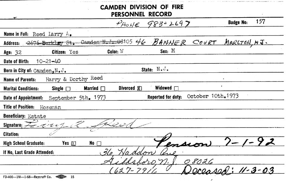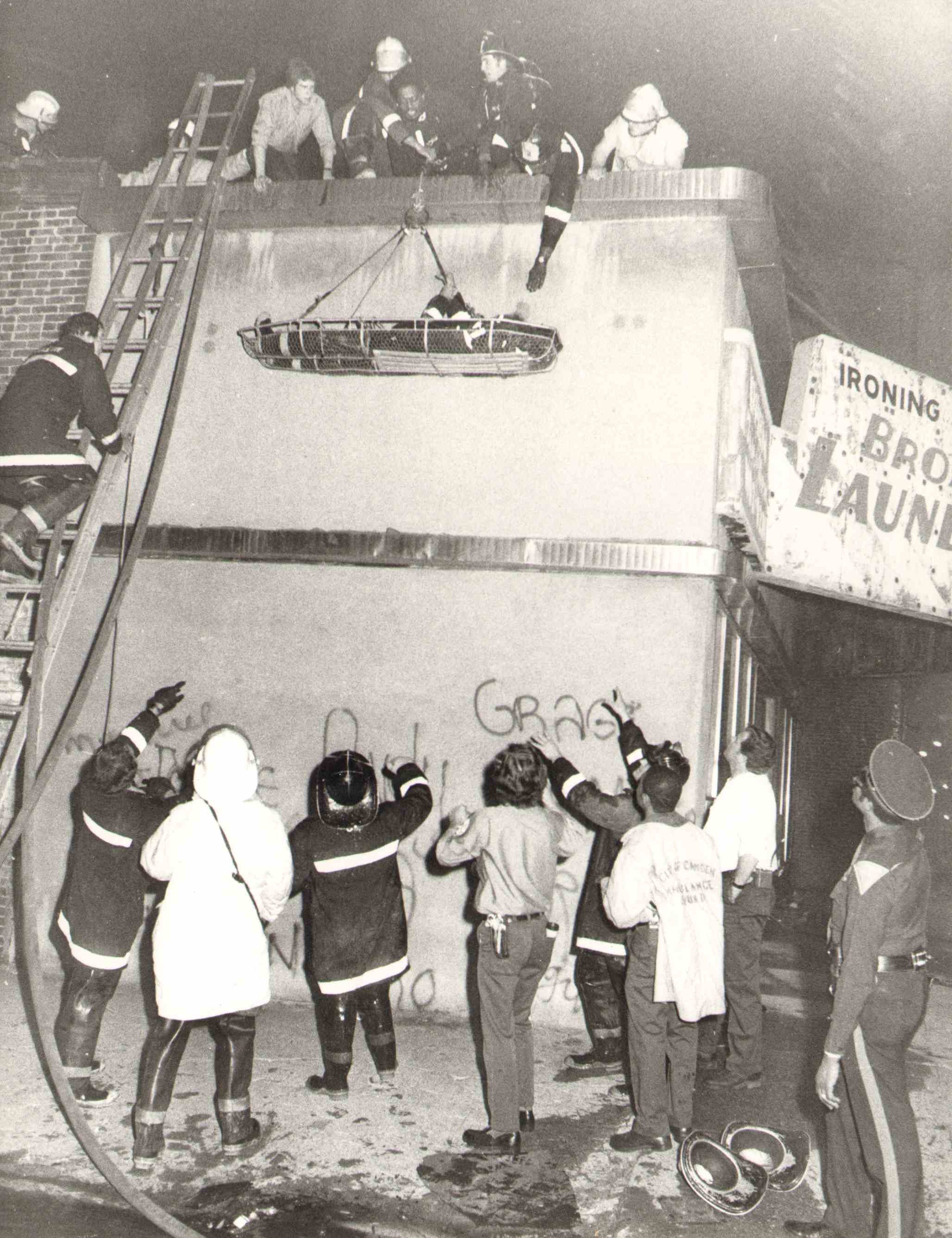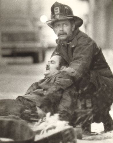 18, 1986 Firefighter Larry Reed assists Firefighter George Reese at a Second Alarm fire in the 500 Block of Kaighn Avenue Photo by Frank Saia |