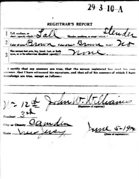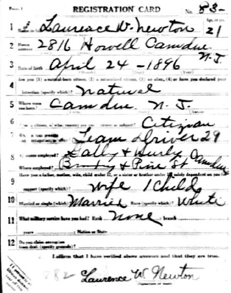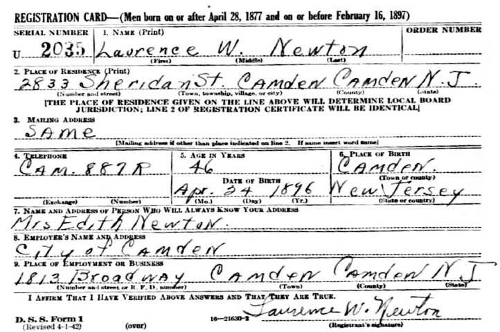 LAURENCE W. NEWTON was born in what was then Stockton Township, New Jersey during the month of April, 1896 to Charles B. and Emma Newton. Stockton Township, which comprised present-day East Camden and Cramer Hill, was united with Camden in 1899, and the street on which the Newton family lived, Sherman Avenue lay in Cramer Hill. Charles Newton had been living in Stockton Township as far back as 1870, had been living in the neighborhood as far back as 1887, and in the home, 2833 Sherman Avenue, as early as 1890. When the census was taken in 1900 the Newton family, which then included older brother Harry Newton and sisters Gertrude and Mary Newton, made their home at 2833 Sherman Avenue in Cramer Hill. Charles B. Newton had worked as a carpenter, then worked as a car builder, and would later be employed as a teamster. There was another Newton sibling then not living at home. Laurence W. Newton does not appear in the 1914 Camden City Directory, however, by 1917, when he registered for the draft, he had found work as a teamster at the Gately & Hurley Department Store at Broadway and Pine Streets. He was then married and residing with his wife Edith at 2816 Howell Street in East Camden, just across the tracks from his parents home on Sherman Avenue. By 1924 Laurence and Edith Newton had moved to 2833 Sherman Avenue, the home of his parents. By this time he was working as a member of the Camden Fire Department. The 1929 Camden City Directory shows that they had moved to 927 Beideman Avenue in Cramer Hill, and that Edith Newton was also working as a clerk at the Stockton Coal Company at North 27th and Pleasant Streets in East Camden. The 1930 Census shows that this was still the case in April of that year, and that their son, Joseph, then 14, was still living at home. Laurence Newton rose through the ranks of the Camden Fire Department and by the early 1940s was serving as a Battalion Chief, based out of the Engine Company 3 firehouse at 1813 Broadway. By 1942 the family had moved back to 2833 Sherman Avenue in Cramer Hill. On Saturday, November 22nd, an elderly woman burned to death in a hot, vicious fire at Front and Danenhower Streets, North Camden; and on Thanksgiving Day, November 25th, a spectacular third alarm destroyed the Adams Furniture Warehouse at Locust Street and kaighn avenue, South Camden. At 3:45 A.M. a milkman discovered the fire and flagged down a passing police car who sounded the alarm. 3rd Battalion Chief Laurence Newton as the first arriving unit, found heavy fire gaining headway in the building and quickly transmitted a second alarm. Chief of Department Lennox would transmit a third alarm and while the warehouse was heavily damaged, firemen prevented the blaze from extending to nearby dwellings. Fear of enemy air raids in 1942 spawned a number of Federal Decrees regulating public conduct in the event of air raid warnings. One new Federal Regulation prohibited fire apparatus from using sirens in response to alarms. Under war-time regulations, sirens would be reserved exclusively for air raid warnings. The use of audible warning devices by fire apparatus was restricted to bells only. The burden to both fire fighters and the public safety was formidable. On March 1, 1942, the inevitable happened. Engine Company 8 while responding to an alarm was involved in a collision with a ten ton truck at Third Street and Kaighn Avenue. Upon impact all of the firemen were thrown into the street. The truck driver declared that he failed to hear the bells of the approaching apparatus. The mishap resulted in injuries to six members and total destruction of the apparatus. Captain Alvin Thompson was listed in critical condition, while Firemen Mitchell Wojtkowiak, Philip Farrow, Leonard Oshushek, Lawrence Boulton and Edwin Robbins were admitted for lesser injuries. Battalion Chief Newton stated that he believed the accident might have been avoided if fire companies were not prohibited from using sirens. The headlines of the Courier Post for March 24, 1942, read "Six Flee As Heroic Fire Chief Shuts Gas Off Amid Flames". A second alarm for Constitution and Argus Roads, Fairview, was transmitted for a fire in two dwellings. Chief Lawrence Newton of the 3rd Battalion was credited with preventing a potential "conflagration" when he dashed into a burning building and turned off a leaking gas pipe that was feeding the flames. This action of course, by Department standards was little more than routine, but to the media and citizens at the scene of the fire, Chief Newton was deserving of remarkable praise. On the morning of February 8th, the dispatcher struck the Box for a reported building at Sixth and Van Hook Streets, South Camden. Arriving first due, 3rd Battalion Chief Lawrence Newton was greeted in the street by a hysterical woman screaming that her baby was trapped on the second floor. The Chief bounded into the building and made his way up the smoke filled stairway. He pushed into a rear bedroom off the stairs and found the child in its crib, the adjoining bed ablaze with fire lapping up the walls. Chief Newton carried the boy to safety just as the first due engine was arriving. 3rd Battalion Aide, Fireman Anthony Valentine, placed the child in the chief s car and rushed him to West Jersey Hospital where he was treated for bums and serious smoke inhalation. Laurence and Edith Newton and their son Joseph appear in the 1943 Camden City Directory, still residing at 2833 Sherman Avenue. Laurence Newton passed away on June 18, 1946 and was buried at Bethel Cemetery in Pennsauken, New Jersey. Older brother Harry Newton had a long career with the Camden Police Department |