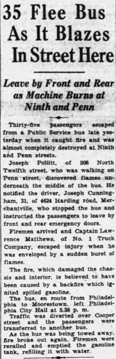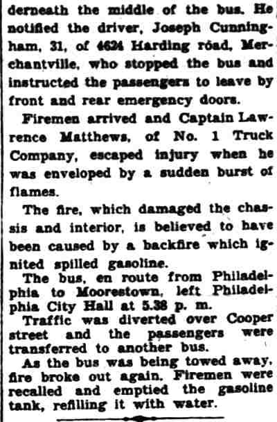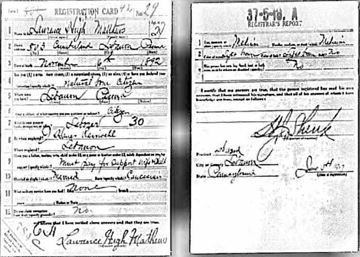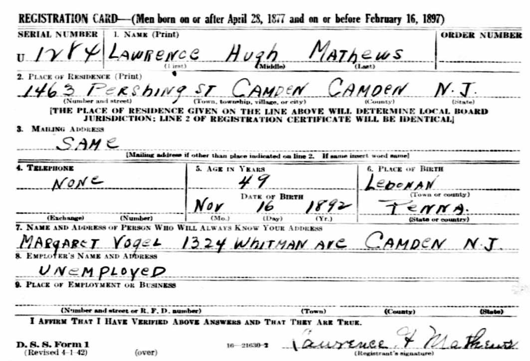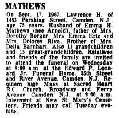 LAWRENCE HUGH MATHEWS was born in Lebanon, Pennsylvania on November 16, 1892. He was one of at least 10 children born to Peter and Annie Mathews. He married Emma Boltz in 1909. Their first child, daughter Dorothy, was born in March of 1910. The April 1910 Census shows Lawrence Mathews and family living with His wife's brother, Walter Boltz, in South Lebanon Township, Pennsylvania. Lawrence Mathews was living with his wife and children in Norristown, Pennsylvania when he registered for the draft in June of 1917. Lawrence Mathews was then working as a laborer. The 1920 Census shows that Lawrence Mathews and his family had moved to Camden. He, wife Emma and daughters Dorothy and Margaret were living at 1471 Pershing Street, the home of Emma's cousin, Raymond Eck. Lawrence Mathews was then working as a streetcar conductor. Two more daughters, Emma and Dolores, were born to the family in the 1920s. The 1924 City Directory shows that he had been appointed to the Camden Fire Department. The family was then living at 1347 Whitman Avenue and were still at that address when the 1927 City Directory was being compiled. By 1929 they had moved to 1463 Pershing Street. Lawrence Mathews was still at that address as late as the fall of 1959. The 1940 City Directory does not show Lawrence Mathews working for the Camden Fire Department. He was unemployed when he registered for the draft in the spring of 1942. He was still residing on at the Pershing Street address when he passed away on September 15, 1967. |