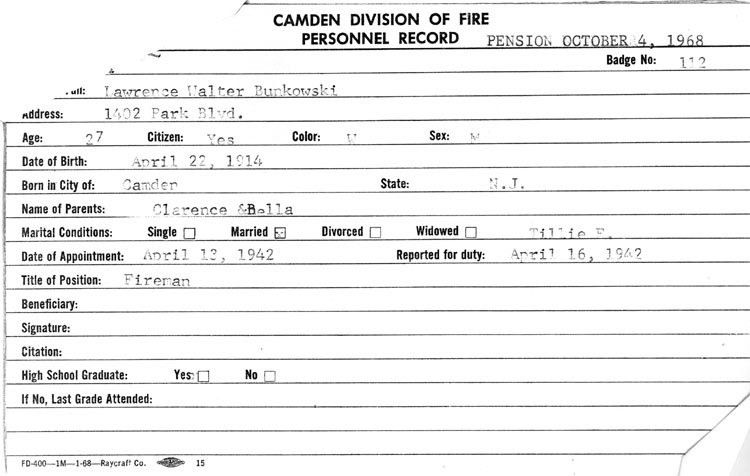 LAWRENCE WALTER BUNKOWSKI was born in Camden, New Jersey on April 22, 1914 to Julian Clement "Clarence" Bunkowski and his wife Bella. He was named after his paternal grandfather. When his father registered for the draft in June of 1917, the family lived at 1264 Everett Street. Besides Lawrence there was a younger sister, Henrietta. Julian Clement Bunkowski also went by the name of Clarence Bunker. By 1924 he was working as a Camden police officer and by 1928 was a detective. Clarence Bunker's brother Joseph J. Bunkowski lived at 1268 Everett and also served with the Camden Police Department. The family was still at the Everett Street address in April of 1930; they maintained a presence at that address as late as the fall of 1969. Lawrence Bunkowski was appointed to the Camden Fire Department on April 12, 1942 and reported for duty four days later. He and his wife Tillie then lived at 1107 Kaighn Avenue, a few doors away from Engine Company 7. They later moved to 1402 Park Boulevard in Parkside. Lawrence Bunkowski had served the City of Camden for over 24 years when he retired from the Fire Department on October 4, 1968. He passed away in November of 1974. His wife later lived in Woodbury, New Jersey. She joined her husband on June 25, 1988. |