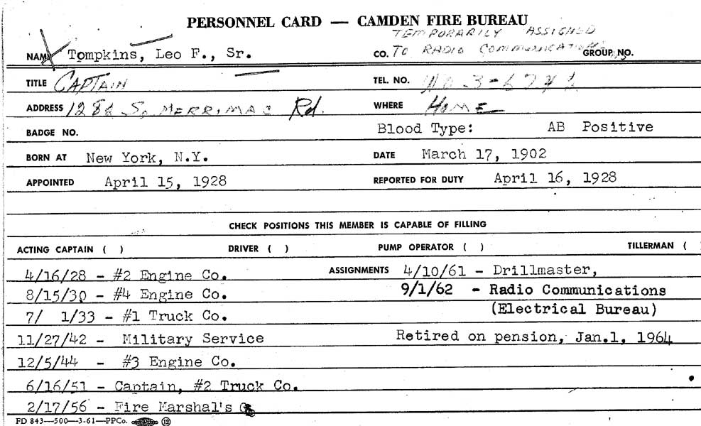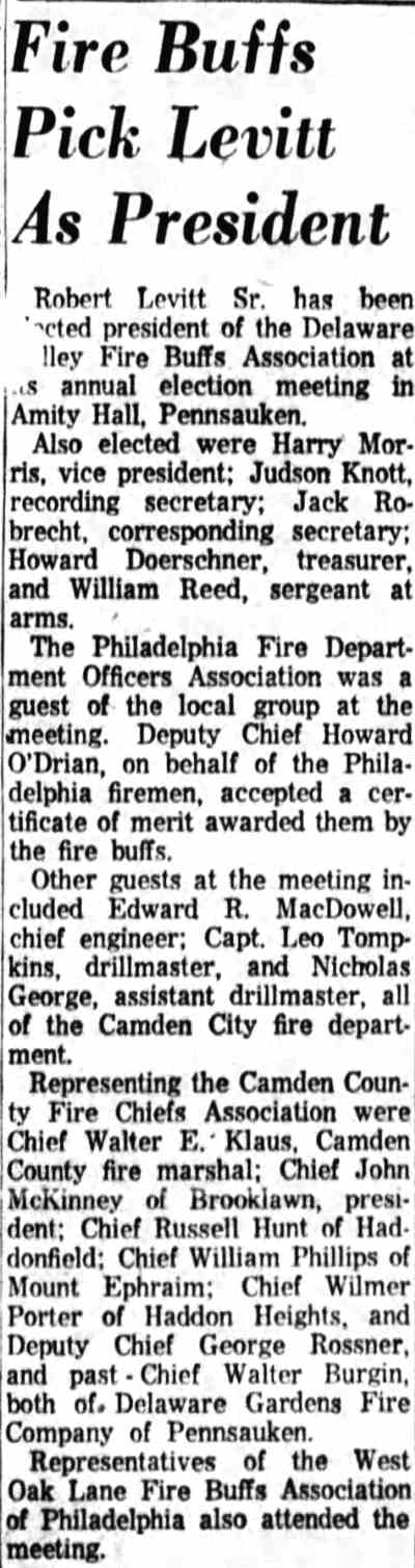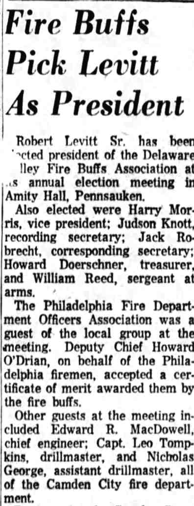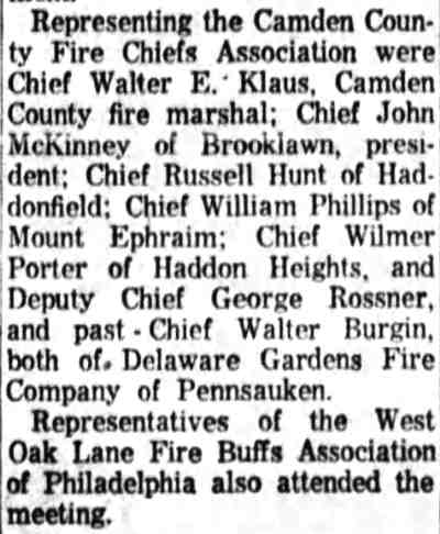 9 Firemen Graduate In City Test Graduation exercises for nine of the city's newest firemen were held Tuesday in headquarters at 3rd and Arch Streets under direction of Public Safety Director Bedell and Fire Chief Edward R. MacDowell. The graduates and their assignments are Joseph Anderson, Canterbury Apartments, No. 1 Ladder; Prescott Johnson, 1238 Kenwood Avenue, No. 8 Engine; Philip Maycott, 1023 North 32nd Street, No. 9 Engine; George Getty, Canterbury Apartments, No. 2 Engine; Ronald Bowers, 617 Clinton Street, No. 2 Ladder; William Young, 3167 Westfield Avenue, No. 2 Engine Company; Wayne Kraft, 1052 N. 35th Street, No. 3 Ladder; Raymond Eldridge, 7 North Dudley Street, No. 7 Engine; and Donald Goehringer, 30 North 24th Street, No. 7 Engine Company. They will receive a starting salary of $4,800. Chief MacDowell said this brings the department to 170 hosemen and to 224 total personnel in the department. All nine were graduated after receiving three weeks of training at the fire school under the direction of Captain Leo J. Tompkins. Their training also included two days at the Navy Fire School at the Philadelphia Naval Base. |