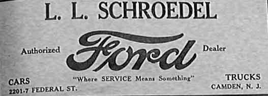 LEO L. SCHROEDEL was born in Germany around 1879. He came to the United States in 1882. At the age of 28 he married. In January of 1920 Leo and Mildred Schroedel were living in West Philadelphia. Shortly thereafter Leo L. Schroedel opened a new car dealership in Camden. His business, L.L. Schroedel Ford, was located in a large building constructed for that purpose at 2201-2207 Federal Street in East Camden where he was doing business as a late as the fall of 1929. He eventually lost the Ford franchise, and the building eventually passed into the hands of Walter Saline, who operated Walter's Auto Body at that location for many years. Leo Schroedel remained in the automobile business throughout the 1920s. He was involved in the fundraising drive that culminated in the building of the Walt Whitman Hotel at broadway and Cooper streets in 1925. In 1903 Leo Schroedel and his wife Mildred were renting an apartment at 105 Westminster Avenue in Merchantville NJ. He was still involved in the automobile business at the time. He is not listed in the 1936 New Jersey Bell Telephone Directory, or in the 1947 Camden City Directory. |