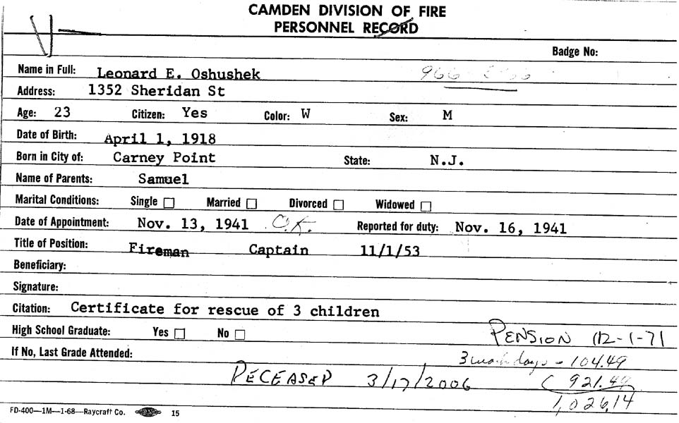 LEONARD EDWARD OSHUSHEK was born April 1, 1918 in Carney's Point NJ to Clara and Samuel Oshushek. The family moved to Camden in the early 1920s. By 1824 samuel oshushek had joined the Fire Department. He and his family, which included sons Leonard and Edwin, lived at 1639 Pulaski Street. Samuel