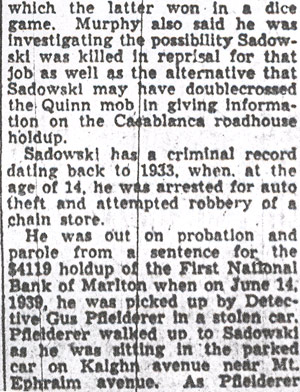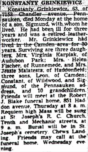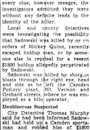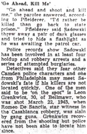 HOLDUP AT RADIO PLANT Two Camden youths, released from Camden county jail, were held by local police yesterday on suspicion of implication in the $11,790 holdup of the Radio Con denser Company, Thorne and cope wood street s, last Friday. They are Leon Grinkewicz, 18, of 1469 Louis Street, and Stanley Geda , 19, of 1273 Whitman Avenue. Although both denied knowledge of the payroll holdup, detectives said they admitted having been close pals of Le Roy Jenkins, 23; of 1161 mec hanic Street, and Joseph Putek, 23, of 1462 Louis Street , who were arrested in Lykens, Pa., on Monday. Grinkewicz and Geda are being held on suspicion but, according to Detectives clarence arthur ; Benjamin Si mon and Clifford Del Rossi , they will be charged today with being material witnesses, while Jenkins and Putak will be charged with the holdup and will be arraigned in police court. Grinkwicz and Geda were arrested yesterday morning on their release from county jail. They had been committed May 9 by Recorder Joseph Patton, of Haddon Heights, for 30 days on charges of loitering with in tent to steal. They were questioned all day by detectives. Detectives said they learned Jenkins and Putak were with Grinkewicz and Geda in Haddon Heights "to do a job" but that the other two dis appeared when Grinkeicz and Geda were arrested. Although they were in the county jail at the time, the detectives said they learned they had participated with Jenkins and Putak in planning the Radio Condenser job five weeks ago. |