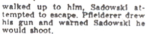 FIFTH SUSPECT HELD IN PAYROLL HOLDUP A fifth man was arrested in the recent Radio Condenser Company $11,790 payroll holdup and held as a material witness yesterday after city detectives alleged he attempted to escape from them in his automobile. He is Nicholas Kubiak, 34, of 1301 Decatur street, owner of a pool room on the corner of Decatur and Norris streets. Arraigned, before Judge Pancoast in police court, Kubiak was committed to the county jail without bail as a witness. City Detectives benjamin simon, Clifford Del Rossi and Clarence Arthur stated they went to the pool room this morning and told Kubiak he was under arrest. He accompanied them to the sidewalk and suddenly stepped into his own automobile parked at the curb. The detectives said he started the engine, whereupon the police car was driven in front of him so he couldn't move. Simon declared that he jumped on the running board of Kubiak's car and reached in to grab the ignition key. Kubiak tried to push him off the running board. Simon said, and the key was obtained only after a tussle. Simon said he has three statements signed by persons who charged they heard Kubiak declare the holdup was planned in his poolroom and that Leroy Jenkins and Joseph Putek were the actual bandits. Jenkins and Putek are charged with the holdup and are held under $3000 bail each. The bail was fixed by Prosecutor Baldwin. Simon stated he previously had questioned Kubiak, but could learn nothing to warrant holding the man until he received the statements late last night. Simon said if he had been able to obtain the statements prior to yesterday, he doubted that bail would have been fixed so low. Two other youths, arrested as material witnesses in the case, were released by Prosecutor Baldwin today under $500 bail each. They are Leon Grenwicz, 18, of 1469 Louis Street , and Stanley Geda, 19, of 1273 Whitman avenue. |