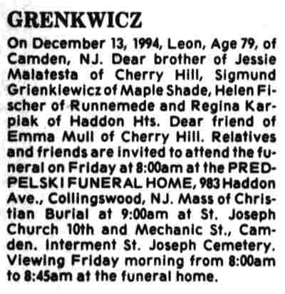 Troncone - Clifford A. Baldwin - Melvin Cain Constantine Grenkwicz - Viola Jackucki - Lucy Jackucki - Helen Jackucki - Joseph Kackucki Sigmund "Sig" Jackucki - Whitman Avenue - Kaighn Avenue - Louis Street |