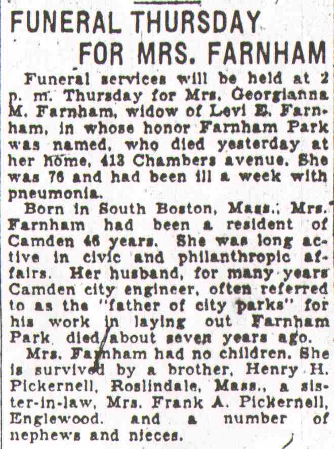 LEVI ELMER FARNHAM was born in Massachusetts around 1856. By 1887 he had relocated to Camden NJ, and was employed as the assistant city surveyor, making his home at 550 Berkley Street. By 1890 he was promoted to city surveyor. Shortly thereafter he was made City Engineer, in which he served for 30 years. The Farnhams lived at 550 Berkley Street from 1887 to 1890. The 1900 Census shows Levi Farnham living with his wife Georgeanna at 416 South 6th Street. By 1906 Levi Farnham, still employed by the City of Camden, had purchased a home at 413 Chambers Avenue, not far from the Berkley Street address. Among those on his staff in the City Engineer's office was Thomas J. Daley. Mrs. Farnham was an active member of the Womans Club of Camden. Levi E. Farnham, for over thirty years City Engineer of Camden, died October 13, 1923 at the age of 67. Still a resident of the Chambers Avenue address, his wife joined him in August of 1931. On December 1, 1927 the City Commission of the City of Camden re-named Forest Hill Park, between Kaighn Avenue and Baird Boulevard and along the Cooper River, Farnham Park in appreciation of Levi Farnham's services to the city. |