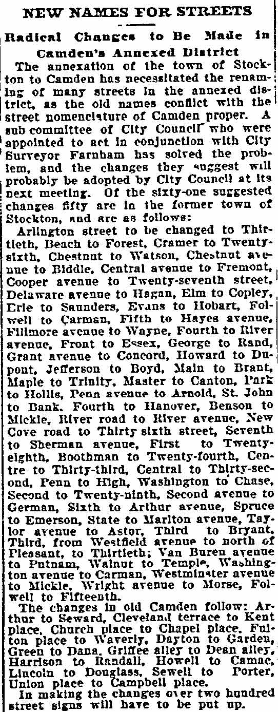 S. Burrough Susanna Danser - Julian K. Potter - G. Bovilla Fry - George T. Phillips Helen E. Herbert - Frank Healy - Peter Verga - Frank Gardner - Broadway Camden Manual Training and High School - Camden Lodge of Elks Amos R. Dease - Levi Farnham - Albert West - Federal Street - Linden Street |