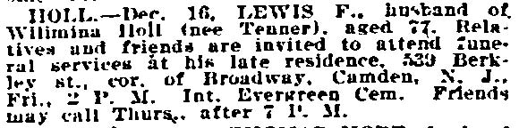 George and Lewis F. Holl built many houses and commercial buildings in Camden in the late 19th and early 20th centuries. The 1887-1888 directory for Camden shows George Holl at the corner of Broadway and Benson Street, and the directory for 1888-1889 has him at 310 Broadway. Lewis Holl lived with his wife Emma L. Holl at 328 Mount Vernon Street, Emma Holl also worked as a teacher. During this time the Holl brothers erected 12 three story business properties on the east side of Broadway between Mickle and Stevens Streets. George Holl passed away on April 16, 1912, and Lewis on December 18, 1919. The brothers were buried in adjoining plots at Evergreen Cemetery in Camden. The properties on Broadway remained in the family for a time, but eventually found their way into Orphans Court, and were sold at auction in 1941.