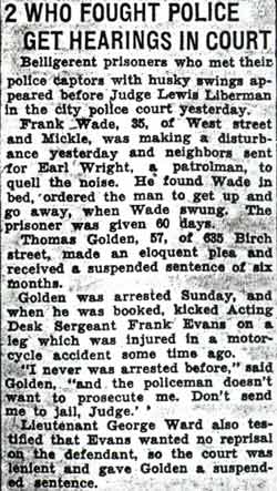 WOMAN SHOUTS MURDER AND POLICE RAID HOUSE Charged with allowing disorderly persons to congregate in her home, Mrs. Elizabeth Holmes, 519 Newton Avenue, was fined $25 by Police Judge Lewis Liberman yesterday. She was arrested at 3:00 AM after a call was sent to police headquarters by neighbors, that a woman had screamed "murder" in the house. Arrested with her were Mary Williams, 38, also of the Newton Avenue address; Charles Weatherby, 28, of 540 Division Street and Edward Werner, 26, of 707 New Street. They were charged with being inmates. Sergeant John Deith and Policeman Earl Wright said they found whiskey on a table after they went \to the house in response to the complaint. Wright testified he had to climb the rainspout to get in. Mrs. Holmes denied the charge but was found guilty. The other woman and the two men were fined $10 each. |