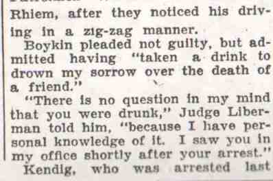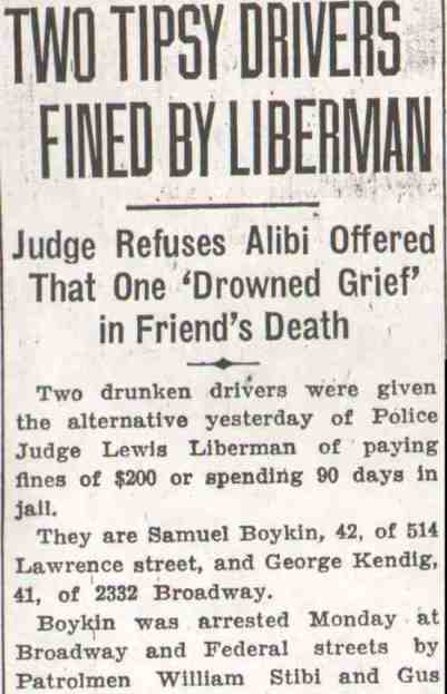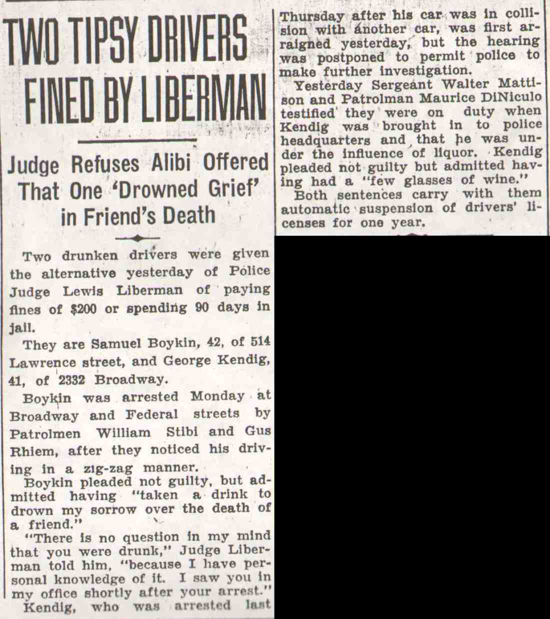 CLEARED DUE TO ICY STREETS Eighteen motorists arrested for minor traffic violations were shown clemency last night in traffic court by Judge Lewis Liberman because of the recent icy condition" of the streets. Walter E. Phillips, 24, Palmyra, was summoned because his car was parked on a sidewalk near Broadway and Kaighn Avenue. He said the ice was so thick he could not tell which was the sidewalk. The charge was dismissed. John Brodgen, 23, of 336 Horton street, Philadelphia, failed to appear in court and forfeited $3 security for passing a traffic light at Admiral Wilson and Baird boulevards. Sakaris Vatne, 45, of 70 Franklin avenue, Laurel Springs, and Leroy Kester, 33, of 53 Park avenue, Oaklyn, who were driving in the rear of Brodgen and followed him past the light, were dismissed. Vatne testified he is on relief and Judge Liberman asked him where he was getting his gasoline. He said on credit. "I guess your credit is good here," Liberman remarked. Ferdinand Gordon, 26, of 23 Miles avenue, Bordentown, posted $2 security also for passing the light at "Fort Laib" at Admiral Wilson and Baird boulevards and appeared in court to answer the charge. "How much did it cost you to come to this hearing?" Judge Liberman asked. "One dollar and 75 cents," Gordon replied. "Well I'll return your $2," Liberman said. "You won't make much profit at that." Fourteen other cases were dismissed and five were postponed. |