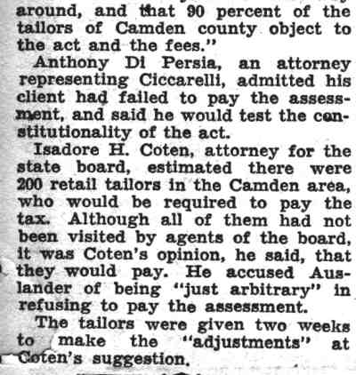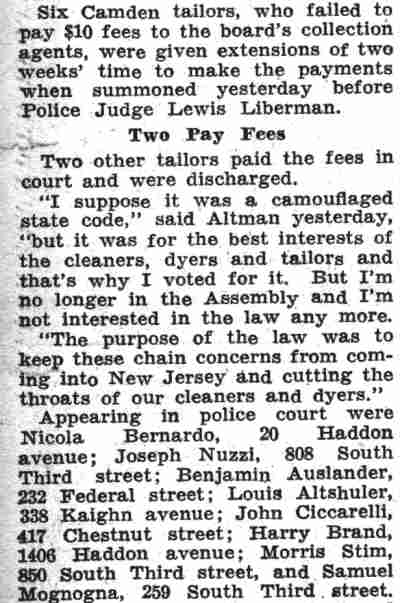 OPEN DRIVE ON SPEED, PARKING Camden Police yesterday began another drive against motorists who violate city traffic regulations. The campaign is an effort to reduce accidents. Lieutenant George Frost, in charge of the traffic bureau, announced the drive would continue for several weeks. On man was arrested today and fined $10 in police court by Judge Lewis Liberman. “I have instructed all motorcycle and traffic police to make a thorough check on double-parking, all day parkers, violators of one-way street signs and speeders,” Lieutenant Frost said today. “accidents have been occurring with increasing rapidity and we are going to do what we can to stop them.” The police official said many office workers in the central section of the city drive their cars to work and park them on busy streets for an entire day. He also pointed out this was the practice on streets adjoining the factory districts and said the two-hour parking law would be strictly enforced hereafter. John Ascola, 41, of 71 Market Street, Salem, was arrested by Patrolman Harry Kreher. Kreher said he chased the car driven by Ascola for more than a mile on Broadway. Asked by Prosecutor John H. Reiners if he knew the speed limit in Camden, Ascola replied: “Yes, 10 miles an hour.” He admitted to “doing 15”. Kreher said it was nearer 50. Ascola paid the fine. |
