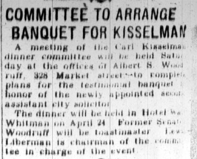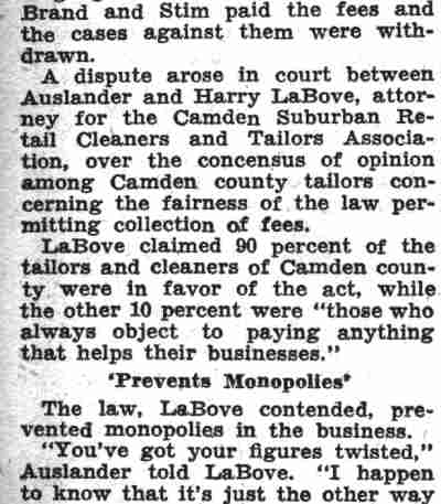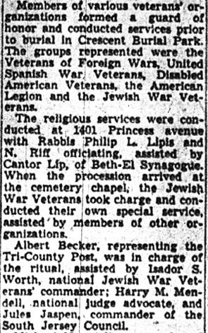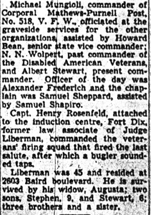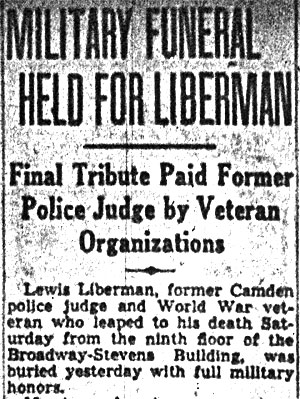 LEWIS LIBERMAN was born around 1895 to Jewish parents who had emigrated from Russia. His parents moved to New Jersey by the following year, when sister Lillian was born. Brothers Harry, Jacob, and David were born in New Jersey between 1900 and 1910. By January of 1920 the father of Lewis Liberman had passed away, leaving his mother, Ida Liberman to raise her five children. The 1920 Census reports that Ida Liberman was then the proprietor of a show store, and that the family lived above the store, at 2417 Federal Street. This building was sold to Aaron Fliegelman by the 1930s, who operated a store there into the 1950s. The Fliegelman's son, Sidney, later went on to a long and succesful career in radio under the name Sid Mark. Trained as an attorney, Lewis Liberman had served in the military during World War I and was practicing law by 1920. He prospered in the 1920s. He married his wife Augusta, and a son, Stephen was born to them late in 1920. When the 1924 City Directory was compiled, the family lived at 2508 Federal Street. By the time of the April 1930 Census the Liberman family owned a home at 2603 Baird Boulevard in East Camden. His first law offices were at 307 market street, but by 1930 he had relocated to 300 broadway, a building owned by real estate and insurance entepreneur Carl R. Evered. In general practice at the time of the Census, Lewis Liberman is recorded in the Camden Courier-Post in January of 1931 as holding the post of Assistant City Counsel for the City of Camden, serving under City Counsel harold w. bennett, in the administration of mayor Winfield S. Price. He later was appointed to the bench, and served as the Judge in Camden's Police Court in 1934 and 1935. Many cases were brought to Judge Liberman by John Reiners and Samuel P. Orlando, who serving as City Prosecutors, Assistant Prosecutor Isaac W. Eason Jr. The Police Court of Camden was a very busy place in these years, and Judge Liberman's name was in Camden's Morning Post or Evening Courier newspapers almost every day during this period. Interestingly enough, both Samuel P. Orlando and Harold W. Bennett lived near the Liberman home at 2603 Baird Boulevard, at 2613 and 2625, respectively, during the early 1930s. Lewis Liberman was aligned with the Republican Party in local politics. When control over hiring of city employees passed from the Republican Party to the Democrats late in October 1936, the result of a New Jersey State Supreme Court decision which finally settled the disputed May 1935 election for Camden's City Commission, Judge Liberman was replaced on the City bench. Lewis Liberman was active in the affairs of the Jewish community in Camden. A member of Congregation Ahav Zedak on broadway, he was a member of Camden Lodge No. 915, Independent Order of B'nai B'rith, and served as president of the Lodge at some point prior to 1928. Something went horribly wrong for Lewis Liberman in the spring of 1941. On Saturday, March 29th, he committed suicide by jumping out of a bathroom window on the ninth floor of the Broadway-Stevens Building. He was buried with full military honors on March 31st. The 1947 Camden City Directory record his wife Augusta at that time still living at 2603 baird boulevard, and working as office secretary at the nearby Alfred Cramer Elementary School at 29th and Benson Street. |