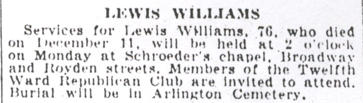 LEWIS WILLIAMS was born in New Jersey in April of 1854. For many years in the latter part of his life he was employed by the City of Camden as a gardener at Forest Hill Park. Lewis Williams married around 1880. He and his wife Anna were living in Hillsborough, Maryland when daughter Olive Nettie Williams was born in 1880, then went to Delaware. Daughter Myrtle was born there in 1887, and in 1890 a son, Roy, was born in Dover, Delaware. By August of 1892 they had returned to New Jersey, son Herman born there in 1892. Lewis Williams was living with his wife Anna at 1533 Federal Street in the town of Stockton, which comprised present day East Camden and Cramer Hill, when the City Directory was compiled for 1899. It is highly probable that he was employed as a groundskeeper at Stockton Park. In 1899 Camden annexed Stockton, and stopped maintenance of Stockton Park. By the summer of 1900 the Williams family had gone to Deerfield, New Jersey, in Cumberland County, where Lewis Williams took up farming. In 1904 the City of Camden purchased the 80 acres of land along the Cooper River that became Forest Hill Park. By 1910 Lewis Williams had returned to Camden to work with the City at Forest Hill Park as its gardener. In December of 1927 Forest Hill Park was renamed Farnham Park in honor of long-time Camden city engineer Levi Farnham. The 1910 Census lists Lewis Williams, his wife Anna, and sons Herman and Roy living at Forest Hill Park, where he worked as a gardener. Anna Williams died prior to the 1920 Census, which found Lewis Williams at Forest Hill Park with daughter Myrtle Winn, a widow, and her son John. The 1930 Census shows Lewis Williams living at Forest Hill Park with his widowed daughter Nettie Conley and her sons, Louis H. and William J. Conley. Louis Williams died at the age of 76 in Camden on December 11, 1930. |