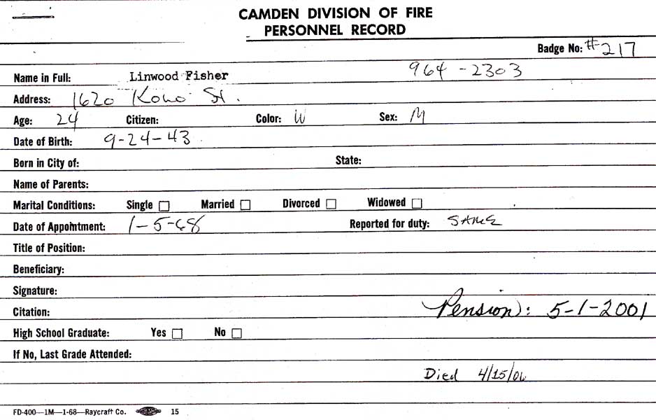 LINWOOD FISHER was born on September 24, 1943 to Samuel E Fisher Sr. and his wife, the former Josephine Huff. His father was a World War II veteran and a member of the Camden Fire Department, and his parents were active members of Wesley AME Zion Church which until the very late 1960s stood at 753 Sycamore Street. The family, which included brother Samuel E. Fisher Jr., lived at 115 Branch Village in 1947, when his father began service with the Fire Department. They lived at 1820 South 10th Street in the mid-1950s. By 1963 the family had moved to 1620 Kolo Street. Linwood