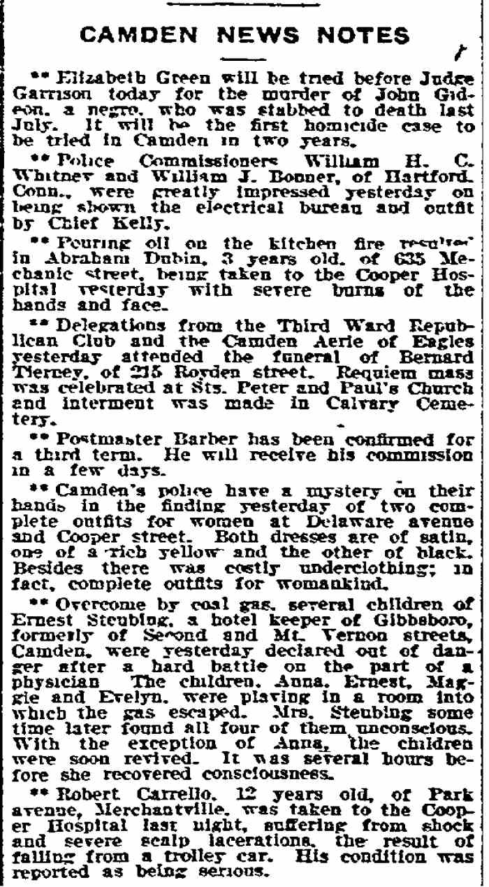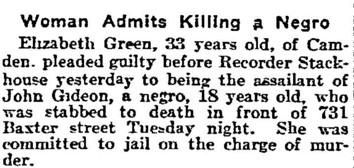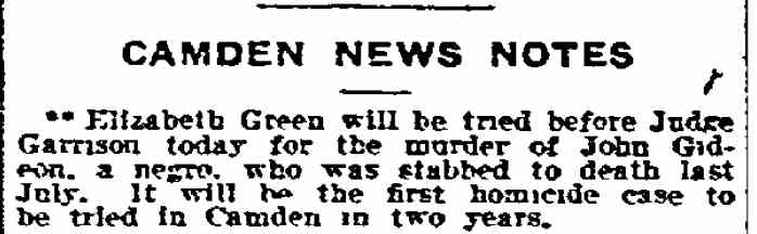 ELIZABETH "LIZZIE" GREEN lived in Camden in the early 1910s, one could easily say on the fringes of society. Little is known about her other than what can be gathered from newspapers, but what can be inferred is that she was ill-tempered, drank a lot, and jealous. Prematurely gray, possibly as the result of her hard living, she stabbed her erstwhile lover, John Gideon in or near rooms they both occupied in the 700 block of Baxter Street, to death in July of 1911, and was put on trial for his murder. Apparently there were no witnesses to the crime, and Green, a white woman, claimed self-defense as her motive for stabbing Gideon. Whether bias on the part of the jury played any role in her acquittal is a matter of speculation. What is not a matter of speculation is that once released from jail, Lizzie Green returned to Camden and the antics that got her in trouble in the first place. She returned to the same neighborhood in Camden and may or may not have taken up with a widower, James Oliver, who had lived on Baxter Street in the 1900s, at 812 Liberty Street prior to the Gideon murder and at 505 Branch Street afterwards. In June of 1912 Lizzie Green was convicted of stealing three dollars from Oliver. She claimed that she had been drinking and was unaware of her actions. At her trial, Prosecutor William T. Boyle referred to her as a menace to society. Judge Howard Carrow sentenced her to six months imprisonment in the Camden County Jail. Lizzie