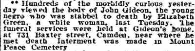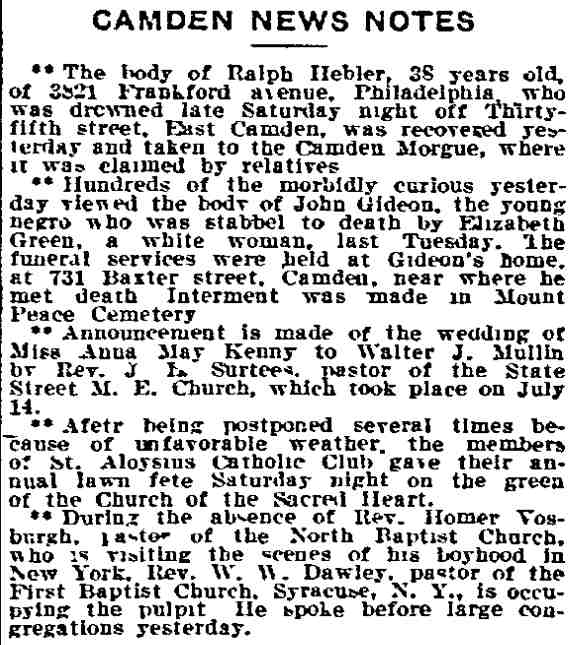 Trenton True American Trenton, New Jersey July 20, 1911 The Trenton newspaper, appears to have gotten the name of the victim and the address where it took place wrong, as there was no house at 716 Baxter Street, and the victim's name was John Gideon. |