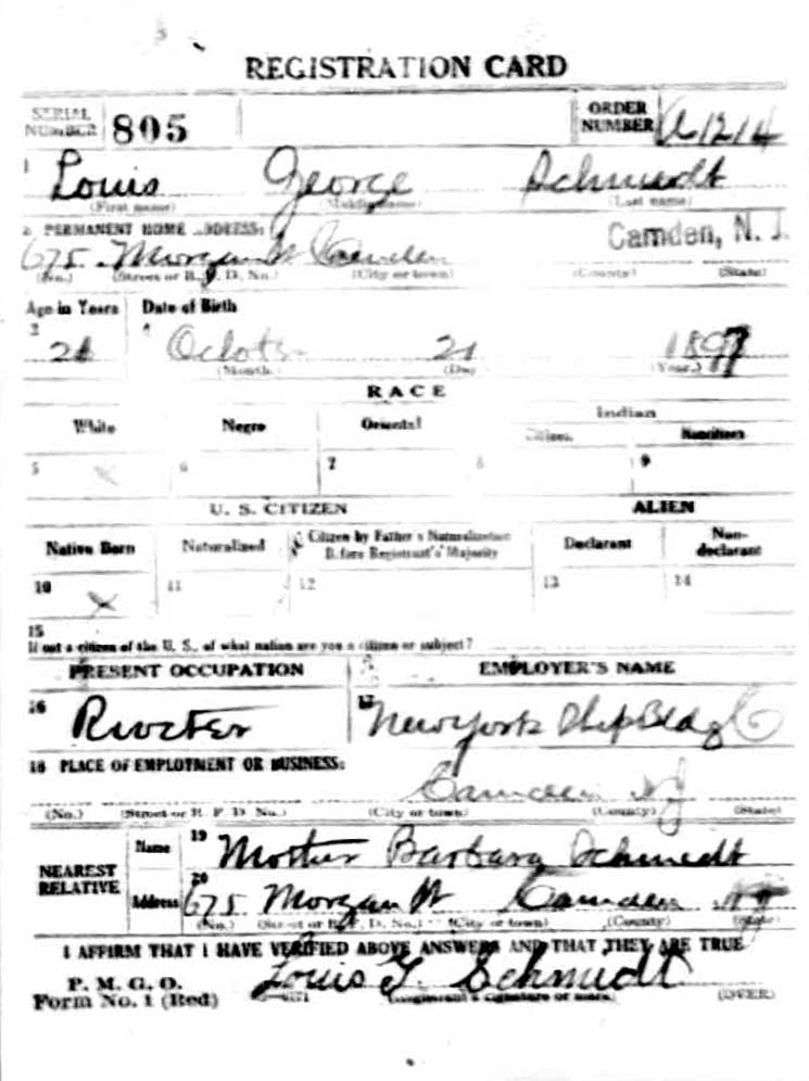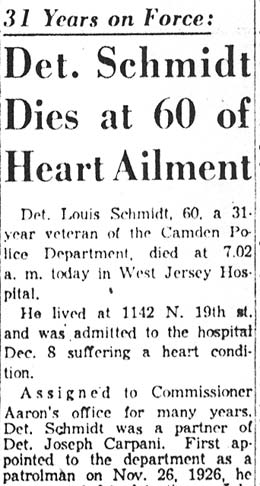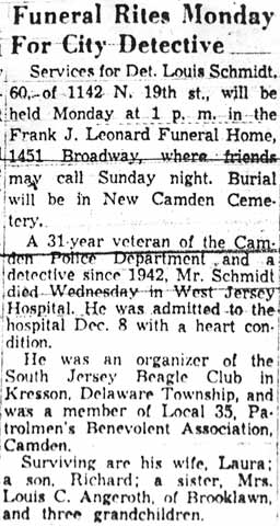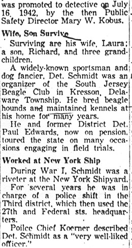 LOUIS SCHMIDT was born on October 21, 1897 in Pennsylvania to Barbara and Ludwig Schmidt. His parents had benn born in Germany and came together to America in 1892. The elder Schmidt worked as a machinist. By 1900 the family, which included older sister Annie, had moved to 685 Morgan Street, a short walk from the New York Shipbuilding Corporation shipyard on Broadway. Another daughter, Louise, was born to the Schmidt family around 1902. By 1906 the family had moved to 669 Morgan Street. Ludwig Schmidt still worked at the shipyard, and Barbara Schmidt ran a candy store at that address. This arrangement continued through at least 1910. The 1914 City Directory does not show that Barbara Schmidt still operated the candy store at that time. Louis Schmidt had followed his father to New York Shipbuilding by September of 1918. By January of 1920 Louis Schmidt had married. He and wife Laura lived at 837 Sylvan Street. His brother-in-law, James J. Monahan, was appointed to the Camden Fire Department shortly afterwards. The 1924 Camden City Director shows Louis G. and Laura Schmidt living at 1174 Sycamore Street, and that Louis Schmidt was a Camden police officer. A son, Richard Schmidt, was born around this time. Louis Schmidt's occupational listing of police officer conflicts with his obituary, which states that he joined the force on November 26, 1926. The 1927 and 1929 Directories shows the couple living at 727 Morgan Street, not far from Louis Schmidt's parents, who were now living at 675 Morgan Street. Oddly enough, the 1927 directory lists his occupation as "riveter", a trade he had followed earlier. The April 1930 Census shows his occupation as policeman, and that that the family was still living at 727 Morgan Street. In 1942 Louis Schmidt was promoted to Detective by Commissioner Mary Kobus. He partnered with Detective Joseph Carpani for much of his career as a detective. By 1947 Louis Schmidt and his family had moved to 1142 North 19th Street in Cramer Hill. This would remain his home until his passing in December of 1957. Besides his activities with the police force, Louis Schmidt was well known as a breeder of beagles, and toured New Jersey competing in field trials with his dogs, along with brother police detective Paul Edwards. Officer John E. Opfer Sr. also belonged to the South Jersey Beagle Club, which, now located in Mt. Holly, New Jersey, is still operating. |