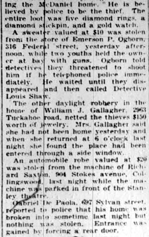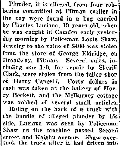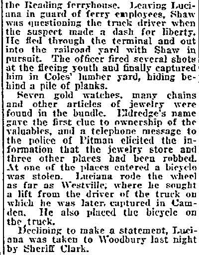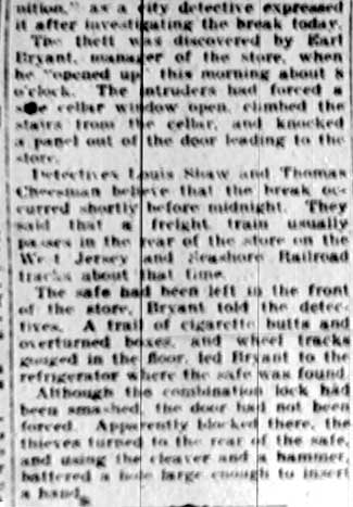 DENIES THIEVES TOOK SLOT MACHINE Lewis Shectman changed his story in police court today and declared that it was only a box of cigars, not a gambling machine that was stolen from his store, 708 Broadway, yesterday by two bandits. Police Court judge Bernard Bertman characterized Schectman as a prevaricator. Shectman denied statements published ion the Evening Courier yesterday, in which he and his wife and daughter related in detail how two men had carried away a gambling machine in an automobile after losing $2 playing the machine. William Gaffney, Evening Courier reporter, was called to the stand and repeated the facts published in yesterday’s paper. “I cannot help but believe you are lying”, Bertman said to Schectman. At the same time Bertman intimated that he would recommend a further investigation of the matter by County Prosecutor Wescott before putting the evidence before a grand jury. Denies Stealing ‘Cigars’ Schectman appeared in Court today against two men the police arrested in the case The defendants are Walter S. Nowak, 22 years old, 442 Jackson Street and Martin Bertherlet, 25 years old, 1218 Pavonia Street. Each was held in $500 bail for the Grand Jury after Samuel P. Orlando, counsel for the two men, had waived a hearing. Orlando, after the hearing today, stated that both men deny the charge of stealing the cigars. He would not comment on the case further, however. Nowak was caught after a two-mile chase through the streets. of Camden yesterday by Schectman and Frank Helm, 2909 Stevens Street, who offered his car as Shectman cried “Help! Robbers!” in front of his store. Nowak was turned over to Patrolmen Nathan Petit and Edward Carroll of the Second District patrol crew. Both Are Identified Berherlat was arrested. Police said he called at headquarters yesterday afternoon and reported that his automobile had been stolen from Hyde Park, Second and Kaighn Avenue. Police said they doubted his story, investigated, and placed him under arrest today. Both Novak and Bertherlat were identified as the two men who rushed from his store yesterday noon, by Shectman. A stir was created in court when the Broadway store proprietor said he did not own a gambling machine, and said that the thieves had stolen a box of cigars. When Shectman, answering a question put to him by Bertman, denied that he had been asked to “change the story” Gaffney was called to the witness stand. Gaffney recited in detail an inter-view with Schectman yesterday shortly following the robbery. How Schectman had said that be had been robbed at a slot machine by two well-dressed bandits and how he had pursued them through the principal streets of South Camden—account of which was printed in detail in Fridays Courier—was told by the witness. Shectman Questioned Questioning of Schectman by Bertman followed statements by Detective Louis Shaw and attorney Orlando. Shaw, asked the nature of the case against Nowak and Bertherlat said that it was over the “larceny of cigars.” Orlando said that he understood that the matter invoilved his clients with the theft of a slot machine from Shectman’s store. Orlando said that his clients denied stealing cigars. Neither of the defendants were called to testify. Following Gaffney’s testimony, Judge Bertman said that he was tempted to hold the complainant under bail. Shectman then again tried to “explain” the alleged discrepancies in the interview Friday and the statements made in court this morning. “I don’t want to talk with you” was Bertman’s answer to Shectman’s request for a “few minutes” with the judge. Police today said that they had arrested Harry Simons, 44, of 1447 South 4th street “on suspicion” last night. After Shectman positively identified Nowak and Bertherlat, Simons was released. An erroneous report of the license number found on the Flint touring car used by the men on their flight from Shectman’s store was made yesterday. The license number, police said, was C16209 and not C16207 as reported yesterday. It was through the tracing of the license number and the report that Bertherlat’s car had been stolen, that the second arrest in the case was made this morning. Police said they figured the car had been used in several South Camden robberies during the past month. Under the law, had Shectman admttted to possession of the slot machine, he would have been subject to a fine. |