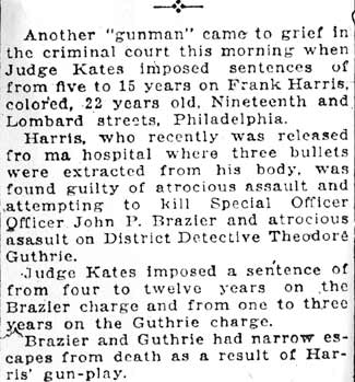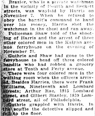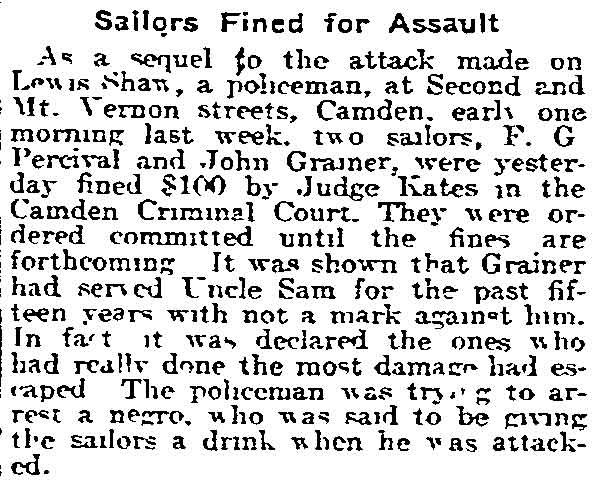 TRY Two “flim-flam artists” who tried to work the “envelope game” on a South Camden contractor late yesterday on Broadway and were caught a few minutes later after a long chase in which police and pedestrians took part, were sentenced to two months in county jail by Judge Bernard Bertman in police court yesterday. The pair gave their names as William Gans, 32 years old, Glassboro Lawns, Glassboro, and Clarence Johnson, 52 years old, Washington. Their intended victim was George Bowyer, 129 Bowyer’s Court, who testified against them in court. City Detective george ward told the court that Gans had a police record in Philadelphia. Johnson, before he was sentenced, said he had tried to work the confidence game on a number of people, but that it had seldom worked. He gave up attempts to fleece gullible people of their money, he added, but had been driven back to that occupation because he was out of work. Here is the story of their activity yesterday, as told in court today: Johnson walked up to Bowyer, at Broadway and Kaighn Avenue, one of the busiest intersections of the city, yesterday afternoon and engaged him in conversation. Picks Up Envelope As Johnson talked with the contractor, his alleged accomplice walked by. Stooping nearby, he picked up a small brown paper envelope of the portfolio type. As he looked into it, Johnson and the contractor walked over. From within the envelope, which po-lice said Gans bad dropped and merely picked up to attract attention of the two men, Gans took a “decoy” hundred do1lar bill, according to the story the contractor later told detectives. Only the figures on the “bill” were visible. The Johnson on acting as though he had not known Gans, decided he wanted a share in the “find”; the contractor’s story went. Gans acceded and both men then tried to learn “how much money” the contractor had in his possession, the latter told police. The contractor’s money, together with the “find”, was to be divided evenly between the three, the men aid. The contractor, becoming suspicious, called to Alfred Trusty and James Gaskins, policemen, who were passing by. One Starts To Run As the prisoners realized their ‘game” was known, Johnson broke from the grasp of the policemen. He dodged through a gathering crowd and ran east on Kaighn Avenue , Gaskins, in pursuit. He was caught near Seventh Street. Detectives george ward and Louis Shaw , who grilled the prisoners, said they had defrauded numerous gullible persons in the same manner as that attempted upon the contractor. When the victim turned over his money and the “split” was made, a white envelope, supposed to contain money, would be handed to the “lucky participant” in the find. The “finder” and his aide would disappear. Then the envelope would be found to contain nothing but a few worthless papers, the detectives said. Gans was arrested in Philadelphia about five months ago for “working” the “flim-flam game,” Ward said. He also served time in Goldsboro, N. C., for carrying concealed deadly weapons, the detectives said. Both prisoners are colored and are said to have mulcted only colored persons. Several complaints had been received about their activities, Ward said. Last week a man reported losing more than $80 in a similar “exchange.” Names of complainant, were withheld to prevent embarrassment, detectives said . |