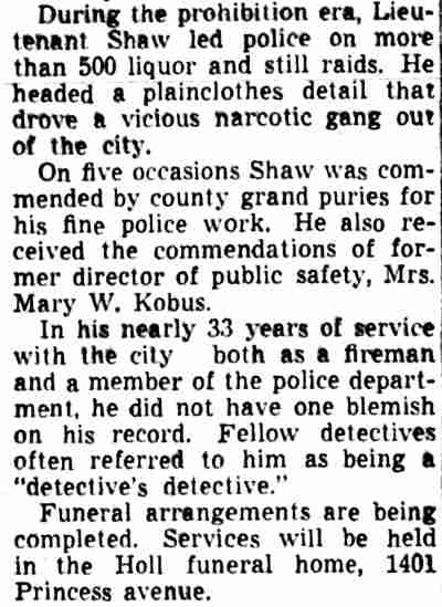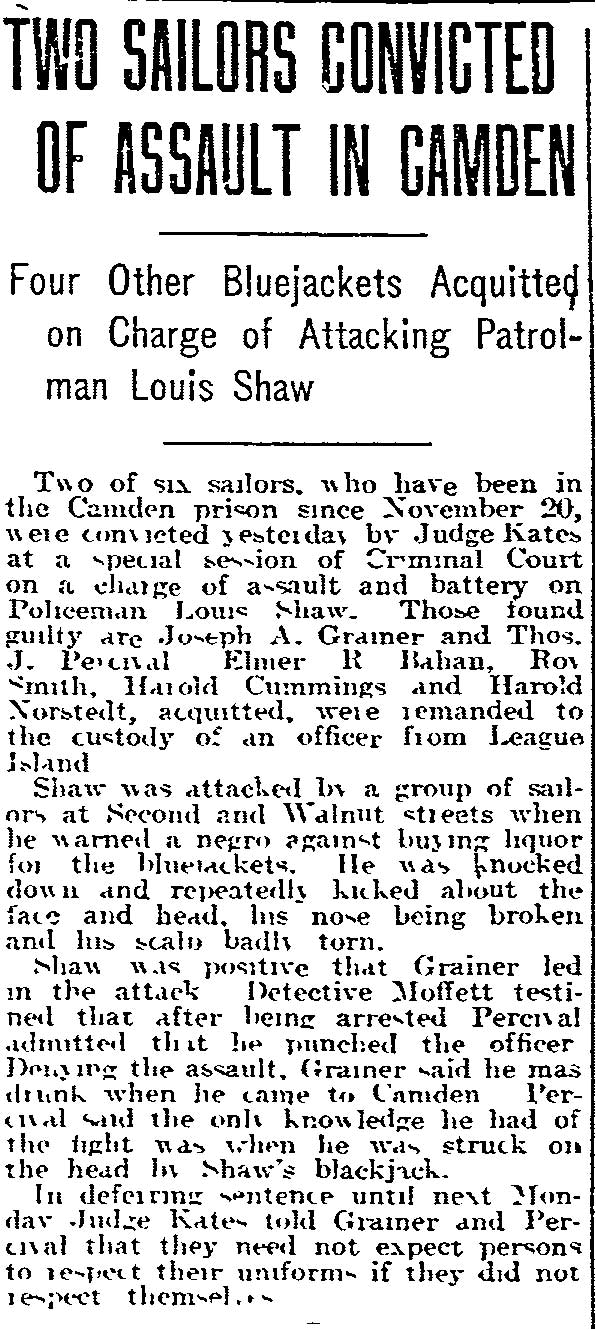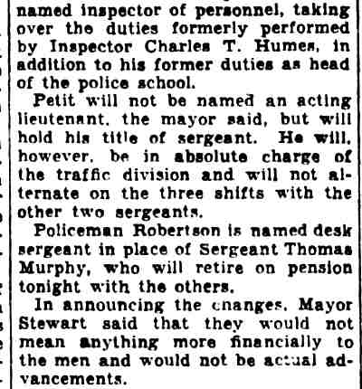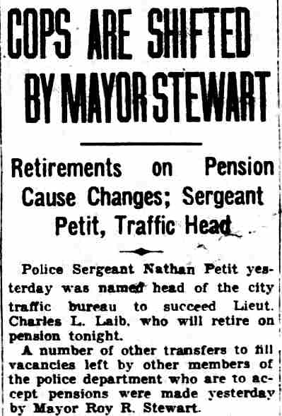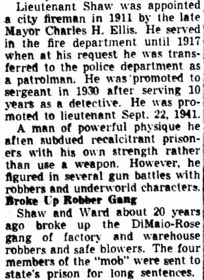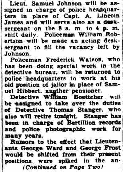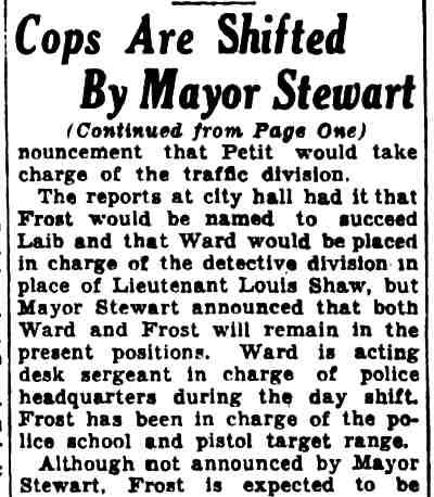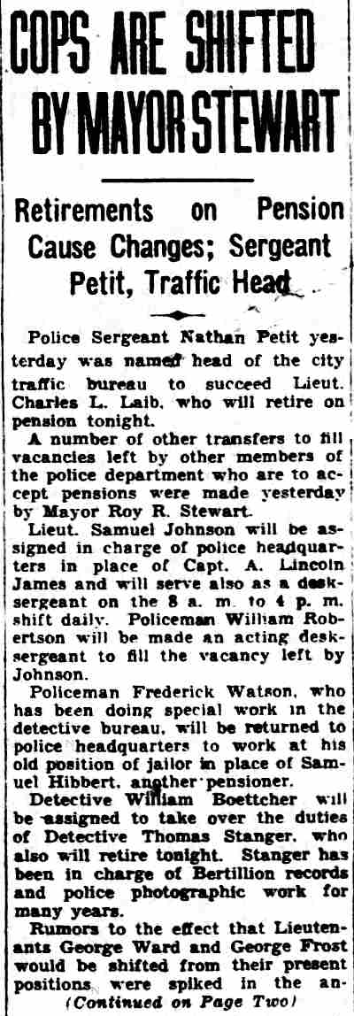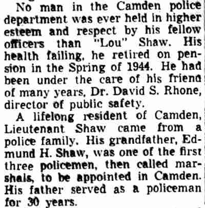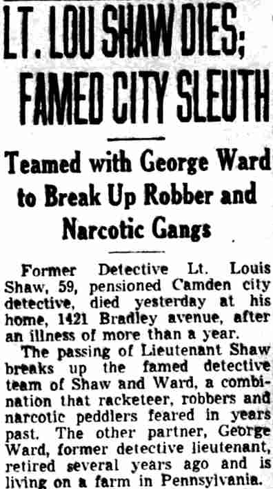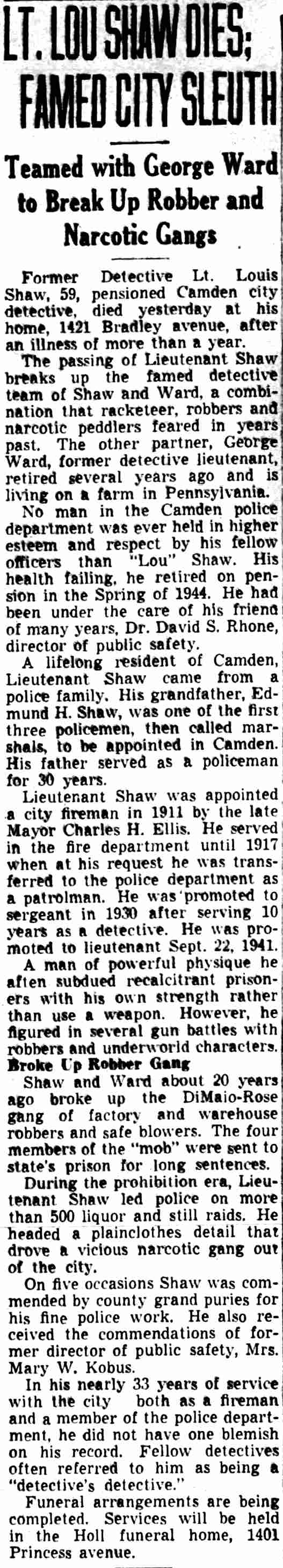 SHAW MADE ASSISTANT IN PLACE OF KOERNER In a shakeup of Camden police officials yesterday afternoon Lieutenant Samuel E. Johnson was named acting chief of detectives by Commissioner Mary W. Kobus, director of public safety. Lieutenant George A. Ward, who has been in charge of the detective bureau for a year, was transferred to take Johnson's place in charge of headquarters. Detective Louis Shaw was made assistant to Johnson, replacing Detective Sergeant Gus Koerner. Koerner was transferred to the Second District, for radio car and street duty. The new order became effective at 4:00 PM yesterday Police Chief Arthur Colsey announced the changes in the bureau after a two-hour conference with Commissioner Kobus yesterday afternoon. Maurice Di Nicuolo, who has been an acting detective, was transferred to the First Police District, with former Acting Detective Clifford Del Rossi returning to his old post in the detective bureau. In the only other transfer announced, Sergeant Harry Newton was switched from the First Police District to the Third, with Sergeant Edward Carroll going from the Third to the First. Although no other changes were made public, it is believed yesterday’s are a forerunner of numerous shifts to be made today or early next week.’ “These changes are being made for the good of the service,” Commissioner Kobus declared. “There will be other transfers of officers and men so that all the police may familiarize themselves with all the branches of the department.” Lieutenant Johnson was a appointed a policeman on January 1, 1910. After 10 years as a patrolman, he was promoted to a detective, where he made a splendid record. On November 28, 1928 he was made a sergeant, and again promoted on April 8, 1930, when he became a lieutenant. Ward was appointed a policeman on August 2, 1917, promoted to detective January 1, 1927, sergeant November 14, 1928 and lieutenant on January 24, 1930. Johnson was a detective sergeant when former Police Chief John W. Golden was head of that bureau, but later was transferred to police headquarters. Ward has been in and out of the detective bureau several times. He served for a time as the commander of the First District and later was ion charge of the police headquarters on the 12:00 midnight to 8:00 AM shift. He was a political lieutenant of former Public Safety Director David S. Rhone. |