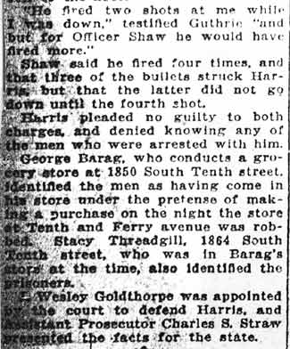 Enlivens Numbers Trial Here A mysterious piece of paper yesterday precipitated a verbal battle between Assistant Prosecutor William C. Gotshalk and Defense Attorney Walter S. Keown upon opening of the trial of joseph and Fred Klosterman on charges of number writing. They were placed on trial before Judge Samuel M. Shay and a crlminal court jury. Acting Lieutenant Louis Shaw, of the city detective bureau, testified of a raid on the Klosterman saloon at Mechanic and Green streets and an adjacent house at 1312 Green street. The witness identified a brief-case containing numbers slips and also a postal card addressed to "f. klosterman." When Shaw was turned over to Keown for cross-examination, the defense counsel reached into the case, pulled out a piece of paper and asked how it had gotten into the bar. When Shaw said he had put it there, Keown declared: "Well, put it into your pocket. It has nothing to do with this case." Shaw refused, whereupon Keown rolled it up into a ball and put it in his own pocket. At this, Gotshalk angrily demanded to see the paper, but Keown declared that "you can't see this until after the jury has gone out." When Gotshalk insisted, Keown said he would give it to Judge Shay. He threw it on the judge's desk, but Judge Shay, who was smiling broadly, made no move to take it. Gotshalk then reached out to get the paper, but Keown was quicker retrieving it and placing it in his pocket again. "What right have you to take a state exhibit and place it in your pocket?" Gotshalk queried heatedly. "I want that paper." "I'll show it to Judge Shay," parried Keown. "I don't want to see it," laughed Judge Shay, as Keown paced around the courtroom, followed by Gotshalk. "It has nothing to do with this case," repeated Keown. And there the matter stood. Shaw testified that he, Detective Clarence Arthur and Patrolman John Kaighn entered the saloon December 10, and went out the back door. They followed a path to the Green street house, broke down the door and found Henry Bagroewski, 17, and his mother burning numbers slips in a stove. Shaw said he recovered a half basket of slips. Shaw and Arthur also declared that they found a bell in the house and that it was connected to a push button in the saloon, allegedly for an alarm. Mary King, deputy city clerk, testified that at the time of the raid the license for the saloon was in Joseph Klosterman's name. Shaw's testimony was corroborated by Arthur and kaighn. Shaw was then recalled to the stand and related that as the three detectives went from the saloon to the other house, the Klosterman brothers followed them and demanded to know "why the dicks are always picking on us." The case will be resumed this morning. . |