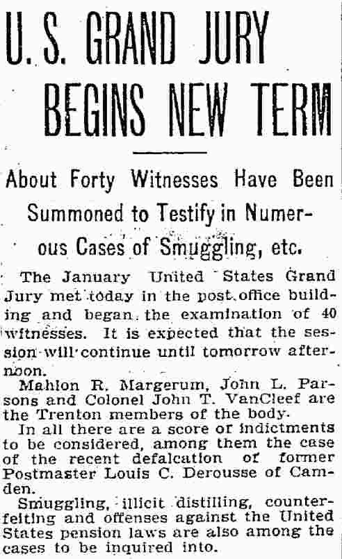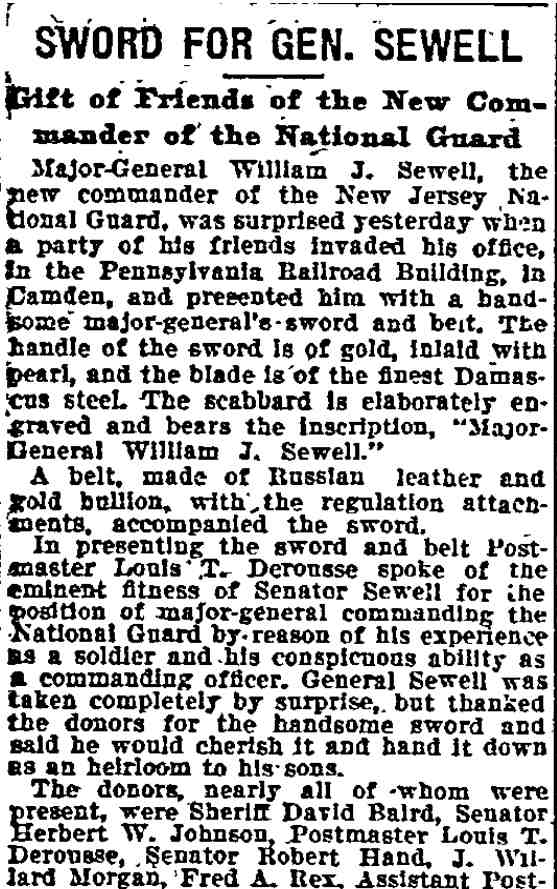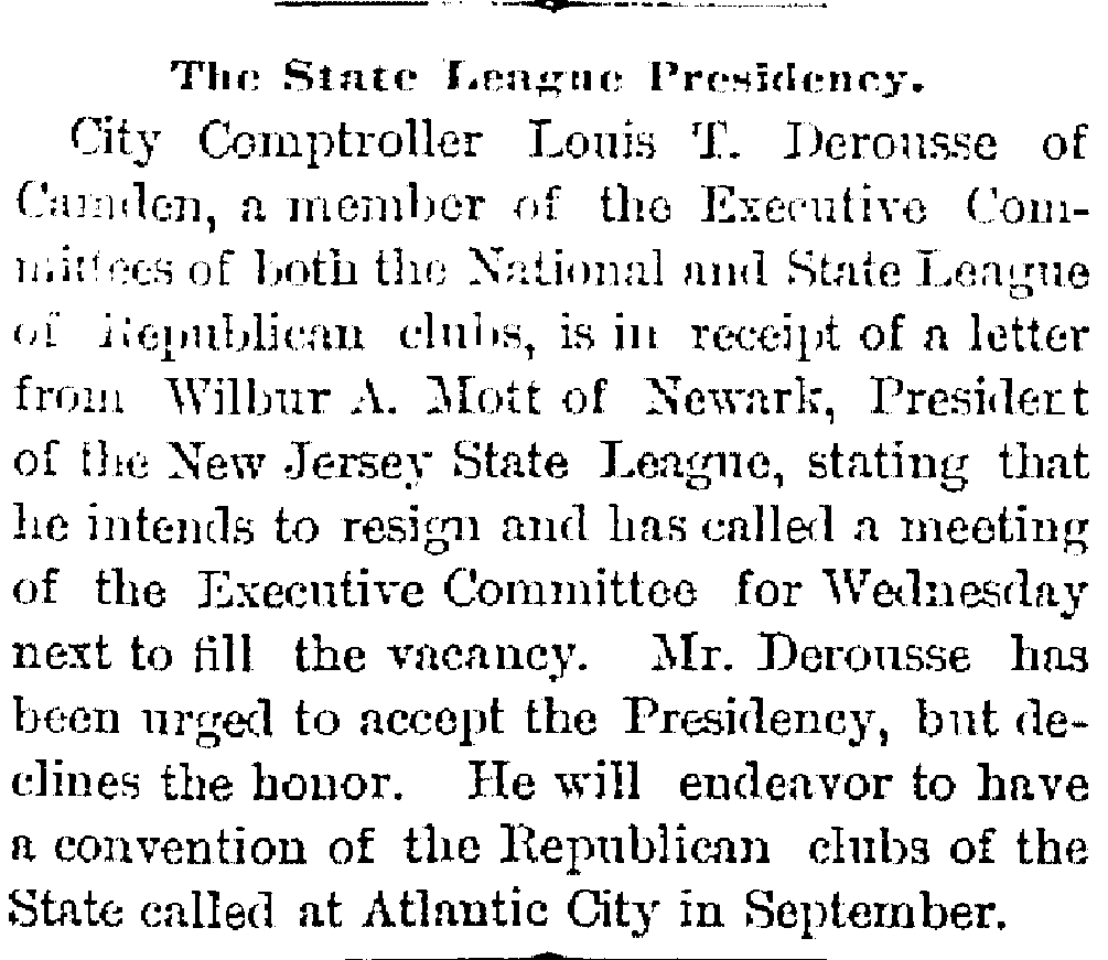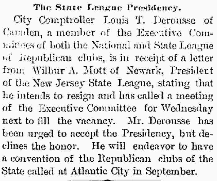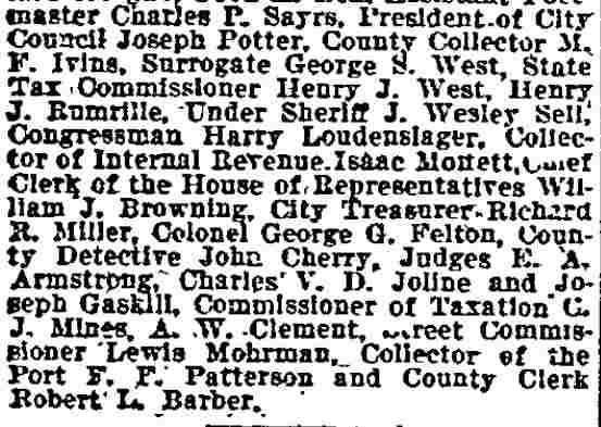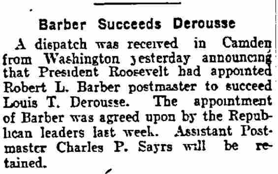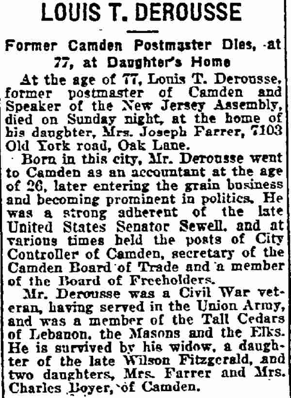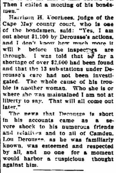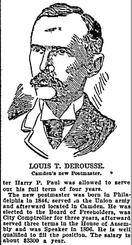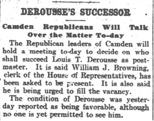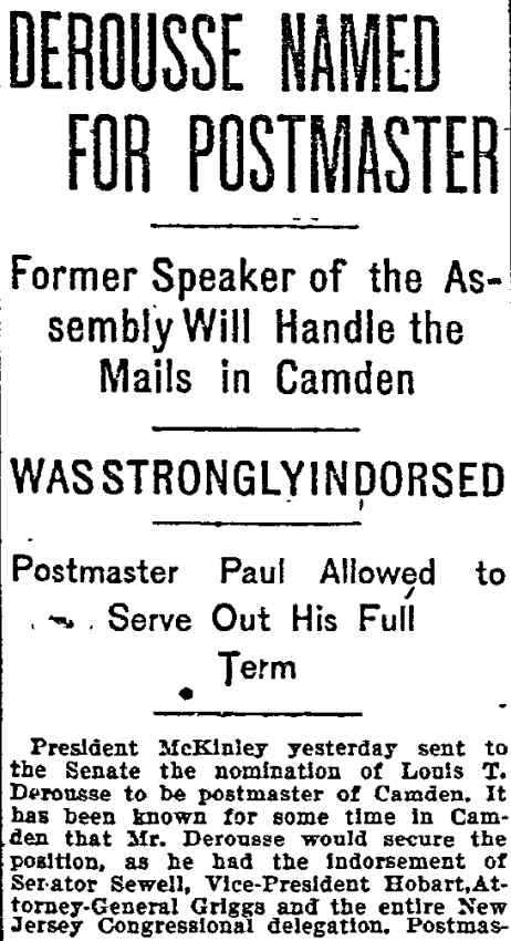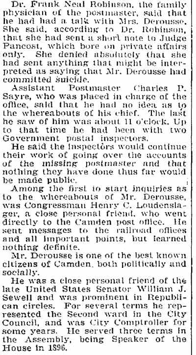 bought out this business but was compelled to give it up owing to ill He was a member of the Board of Freeholders for one term, in 1881, was City Comptroller from 1888 to 1891 and served in the House of Assembly in 1895, '96 and '97, being elected Speaker in 1896. He was appointed Postmaster in 1897, succeeding the late Harry B. Paul, and was re-appointed for a second term a year ago. He is a member of William B. Hatch Post 37, G. A. R. Investigation Going On. Assistant Postmaster Sayrs, who is in charge of the office, was closeted with the two postal inspectors in the postmaster's private office all day, giving them such information and assistance as they requested in the examination of the accounts. From time to time one or another of the clerks would be summoned to give information. All the accounts are being gone over with scrupulous care and attention. The acting postmaster at a late hour this afternoon when requested for a statement of the affairs of the office said he could say nothing until the inspectors concluded their report. He said they expected to complete the investigation by to-morrow afternoon. Asked as to Postmaster Derousse's whereabouts, Mr. Sayrs said: "We know that he is in Baltimore, at the house of a friend." "Has anyone gone to Baltimore to see him?" "Someone will go this afternoon. More than that I cannot say." It was learned that Congressman Loudensinger, who was one of the first notified by City Treasurer Moore, of Philadelphia, of the whereabouts of Postmaster Derousse came across the river and had a conference with Internal Revenue Collector Moffett and Former Postmaster William J. Browning, both close friends of Mr. Derousse. Arrangements were made to send someone to Baltimore to look after him. It was reported that the government officials had taken steps to locate the Postmaster, and that he will be placed under surveillance, pending an official report from the postal inspectors and a decision as to further official action. Government Is Secured. A federal official is discussing the reported shortage in Postmaster Derousse's accounts said the government would lose nothing, being fully secured by the bond. The bondsmen, it is understood, have agreed to make good any shortage. The same official said: "I am utterly unable to account for Postmaster Derousse's flight, even in view of the reported shortage. Had he made known his financial difficulties to his friends they would gladly have come to his relief, rather than have this happen. Mr. Derousse has been worried a great deal of late and talked of domestic trouble. He has spent a great deal of time at the post office, even sleeping on a couch there at nights occasionally of late. I think he anticipated something of this sort." The physician in attendance on Mrs. Derousse said this afternoon that her condition is critical. He broke the news to her as gently as possible of the locating of Mr. Derousse in Baltimore and he at once noticed a slight improvement in her condition. The family had no news directly from Mr. Derousse. |