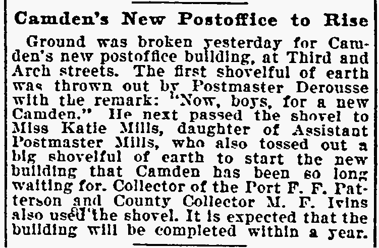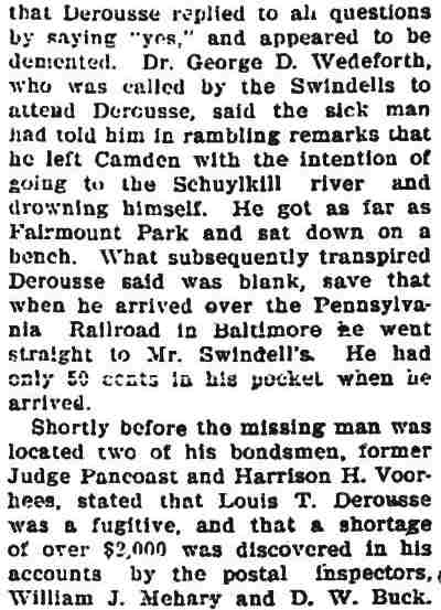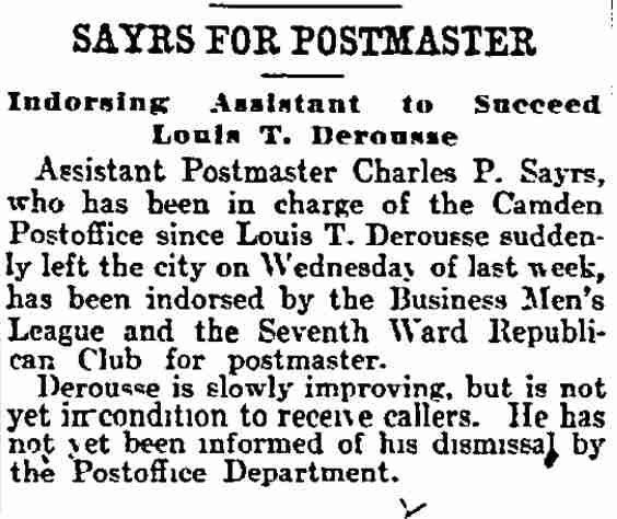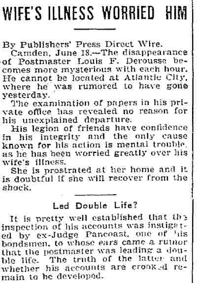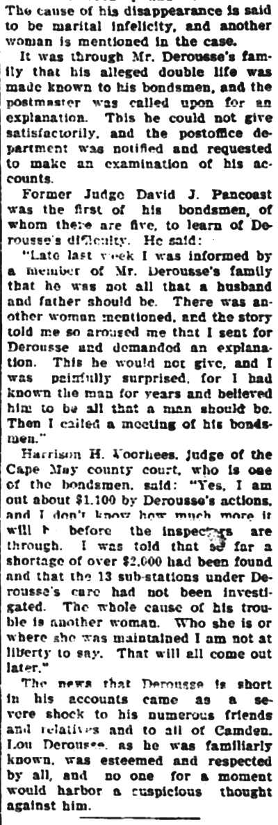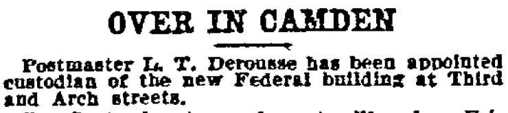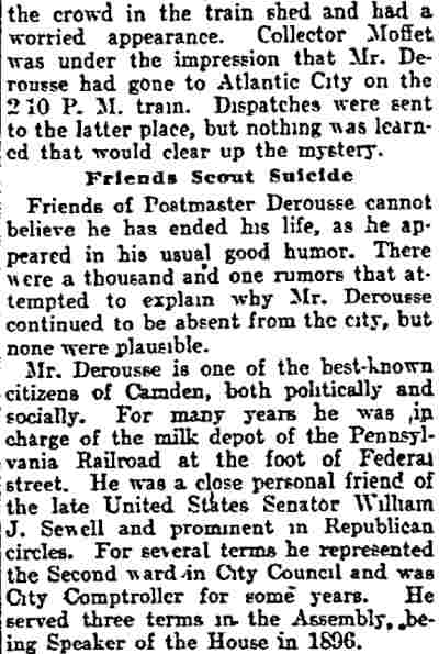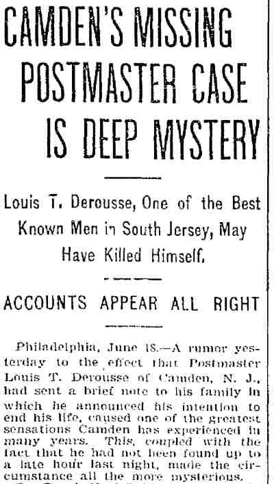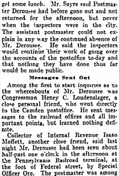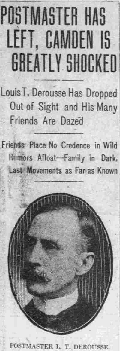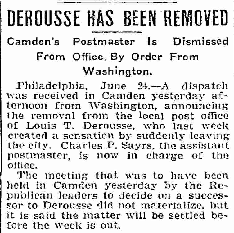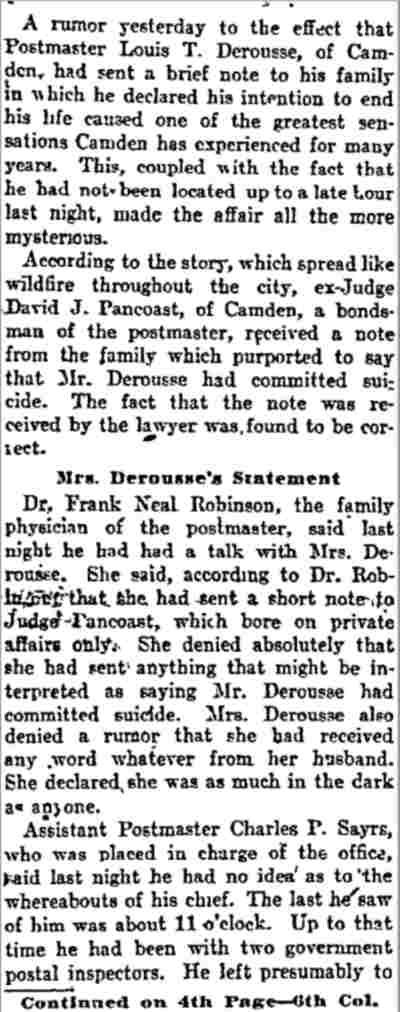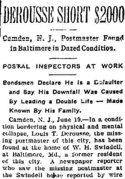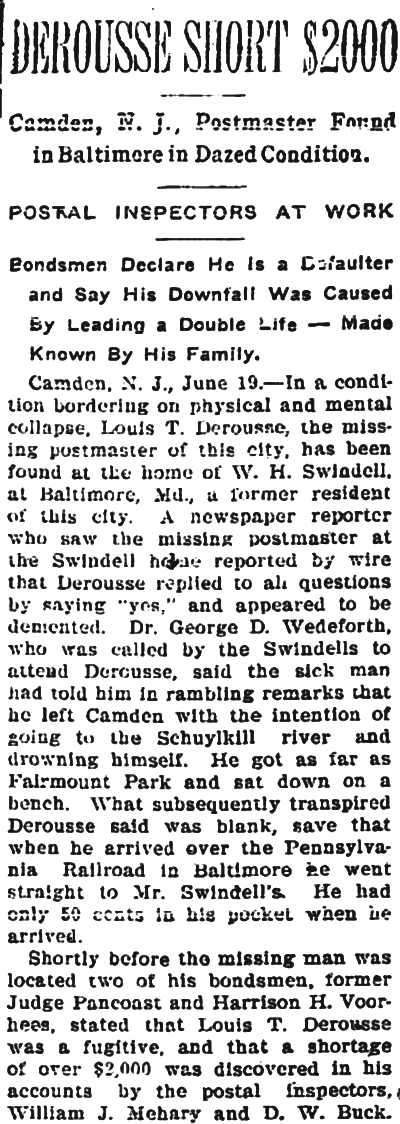 Lawyer Pancoast decided that the best thing to do was to send for the The visit of the inspectors was unlooked for by the Postmaster. He visited the establishment of Emil Moebius about 10 o'clock yesterday morning and procured two photographs of the post office building, saying that he wanted to present them to two friends. He also visited the Camden Wood Turning Company's mill at Front and Arch streets, and ordered six racks for rubber stamp sawed out. From his actions up to the time the inspectors arrived he had apparently no thought of going away. He was chatting in his office with a Post-Telegram man a few minutes before 11 o'clock. Shortly afterward the inspectors arrived and at once took charge. His Flight. The postmaster must have known that he could not avoid the disclosure of irregularities in his accounts. The inspectors at once took charge of the office. He tendered them his aid for a short time and then said he had to go out for a few minutes and would be back to give them further aid. Suspicion of the Postmaster's flight was not aroused until about 2 o'clock. Then it was reported that he had committed suicide at his home. The report spread like wildfire. It was found to be untrue, but at once search was made for the missing man. The last trace of him was found at the Federal street terminal. Joseph Orr, a special officer there, saw him in the crowd. He spoke to him but the postmaster, who looked worried and distrait did not answer. Ore, who is an old friend and fellow G. A. R. man, thought this a strange action. Later when he looked for Derousse the postmaster had disappeared. It is believed that he went across the river, as Assistant Postmaster Charles Sayrs received a letter about midnight, postmarked "West Philadelphia," in which Mr. Derousse said things were wrong at the post office and he thought of ending his life. The letter was mailed late in the afternoon. After reading the letter it was shown to Postal Inspectors Mehary and Buck and also exhibited to the bondsmen. The inspectors suggested that Chief of Police Foster be called in to the case. Found In Baltimore. Friends of the Postmaster continued the search for him all night. Telegrams were sent in every direction. The first authentic news of his whereabouts was received this morning. City Treasurer J. Hampton Moore, of Philadelphia, called up the Post-Telegram at noon, and said he had just received a telephone message from a friend in Baltimore stating that Postmaster Derousse was at his house. This message said that Mr. Derousse arrived there about midnight, that he was in a state of high nervous and mental excitement and talked of suicide. A physician had been called in and was treating him. Treasurer Moore would not give the name or address of his informant at whose house Mr. Derousse was said to be sheltered, but said he was a former Camdenien. It may be that the former Camdenien is William H. Swindell, who was janitor at the Court House some years ago, but has been a resident of Baltimore for four or five years. Shortage In His Accounts The post office inspectors are still at work. They were busy in the private office of the postmaster until midnight and resumed their work early this morning. By 10 o'clock they had reached a conclusion as to the finances of the office and the postmaster's bondsmen were summoned.