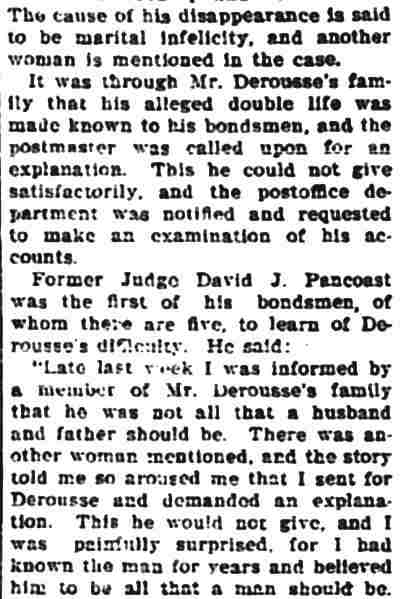 right at the Postoffice and he would probably not be Postmaster Sayrs said as far as he knew no warrant had been issued for Mr. Derousse's arrest, although the indications were that he would be brought back to this city as soon as it was advisable. United States Commissioner Morgan is in Trenton to-day and could not be seen. It is further said that considerable of Mr. Derousse's paper has gone to protest in local banks and he is indebted to well known men for various sums of money. Judge Harrison H. Voorhees is said to have endorsed one note for $1,200, and Wilson Fitzgerald, his father-in-law, is reported to have loaned him $2,000 only recently. Was Mrs. Derousse Applying For Divorce? Another phase was added to the muddled affair this afternoon when it was given out that Mrs. Derousse was about to have commenced divorce proceedings against her husband. This information comes from an authentic source, but the informant said that matters had not proceeded far enough to warrant publication of the details. Papers, it is said, were being prepared and only yesterday morning Mr. Derousse was made aware of the fact that he would soon be called upon to reply to his wife's alleged proceedings. Judge Pancoast is mentioned as being the counsel for Mrs. Derousse and was approached upon the subject on Market street this afternoon. The Judge's reply was a curt "I have nothing further to say." Hints Of Double Life.