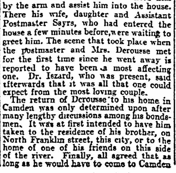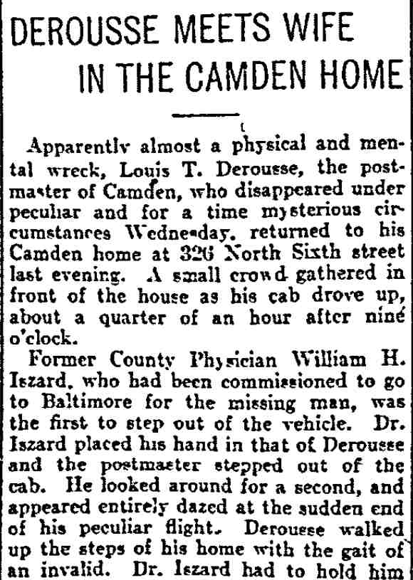 out of the vehicle. Dr. Iszard placed his hand in that of Derousse Derousse walked up the steps of his home with the gait of an invalid. Dr. Iszard had to hold him by the arm and assist him into the house. There his wife, daughter and Assistant Postmaster Sayrs, who had entered the house a few minutes before, were waiting to greet him. The scene that took place when the postmaster and Mrs. Derousse met for the first time since he went away is reported to have been a most affecting one. Dr. Iszard, who was present, said afterwards that it was all that one could expect from the most loving couple. Assistant Postmaster Sayrs spent some time with Mr. Derousse after his return last night and when he left the Postmaster had fallen asleep. It was reported this morning that Mr. Derousse was improved physically and seemed to be more contented, now that he was at home. He was kept secluded from all but members of the family and Dr. Iszard, who called to see him shortly before noon. Rest and medical treatment will, it is believed, soon restore him to his normal mental and physical health. Dr. Iszard's Trip. As told in yesterday's Post-Telegram, Dr. Iszard went to Baltimore yesterday morning on the 10 a. m. train. He arrived at noon and drove at once to the residence of William A. Swindell, former custodian of the county buildings in Camden, at 422 North Carey street, where Derousse made his unexpected appearance after his flight from Camden. The visit of his Camden friends had a tendency to cheer Mr. Derousse up in a measure. After a talk with him Dr. Iszard decided that the postmaster was in a condition to be removed to his home. The doctor brought with him to Baltimore a sealed letter from Mrs. Derousse to her husband, which had been placed in the former's hands by Dr. Frank Neall Robinson, the family physician. The letter was a pathetic plea from the wife for her husband to return home and that everything would be forgiven and forgotten. It was after reading the letter that Mr. Derousse declared he would not return home. The letter he gave to Dr. Iszard. On the train he asked for it, and pondered over its contents, while tears trickled down his cheeks. Putting the letter in his pocket, he said, "Well, I may go home, after all." Cheerful Greeting It was a cheerful greeting which Mr. Derousse extended to Dr. Iszard at Mr. Swindell's hospitable home. He appeared the same "Lew" Derousse that everybody knew in Camden. But almost the next instant he was reverting to his troubles. "I want to say that I owe my life to Will Swindell," he exclaimed. "Had he not received me as he did I would have killed myself."
