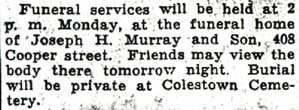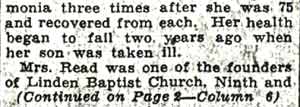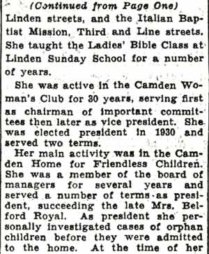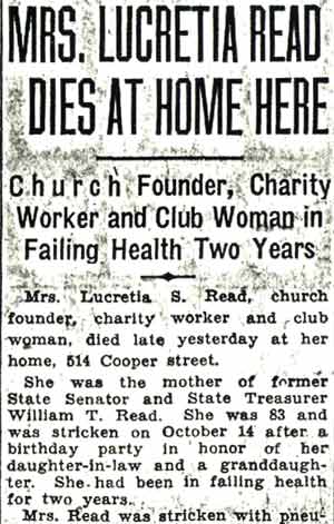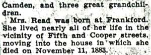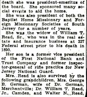 MRS. LUCRETIA S. McCORMACK READ was born in the Frankford section around 1853. Early in life she moved to Camden NJ. Known to friends as Lulu, she married William T. Read at the age 20. The 1880 Census shows Mr. and Mrs. Read living with their one-year old son at the home of her widowed mother, Mrs. Augusta McCormack, at 710 Market Street in Camden. The Read family moved to a home at 514 Cooper Street on November 11, 1883. By 1887 William T. Read Sr. had his own real estate and insurance business at 227 Federal Street. In 1890 William T. Read Sr. died, leaving his wife and son William T. Read Jr. She did raised her son to a high standard, as William T. Read Jr. would have a long and successful career in law, banking, and politics in Camden, serving as State Senator, State Treasurer, and was at one time a vice-president of the First Camden National Bank & Trust, where he worked with F. Morse Archer. His son Walter would later partner with Archer's son in the still prominent Archer, Greiner, & Read law firm, known in 2003 as Archer & Greiner. After her husband's passing Mrs. Read involved herself in many community activities. She was one of the founders of the Linden Baptist Church, and of the Italian Baptist Mission at South 3rd Street and line streets. Mrs. Read was an active member of the Camden Woman's Club, serving two terms as President in the 1930s. Lucretia Read's main interest was the Camden Home for Friendless Children, where she served in many capacities, including president of the Board of Managers. In 1927, the Plaza Club Hotel, later renamed the Hotel Plaza, was built adjacent to here home at 500-512 cooper street. After 1934 Mrs. Read's failing health curtailed her civic activities. She died of pneumonia on October 30, 1936, in Camden. After funeral services at the Joseph Murray Funeral Home, located in the next block on Cooper Street, she was buried at Colestown Cemetery in what was then Delaware Township, present day Cherry Hill NJ. Lucretia Read was survived by her daughter, Mrs. Edith German of Merchantville NJ, and her sons Walter N. Read and Dr. William T. Read. Her home at 514 cooper street was converted into a doctors' office building by 1947, and remains in use as of 2004. |