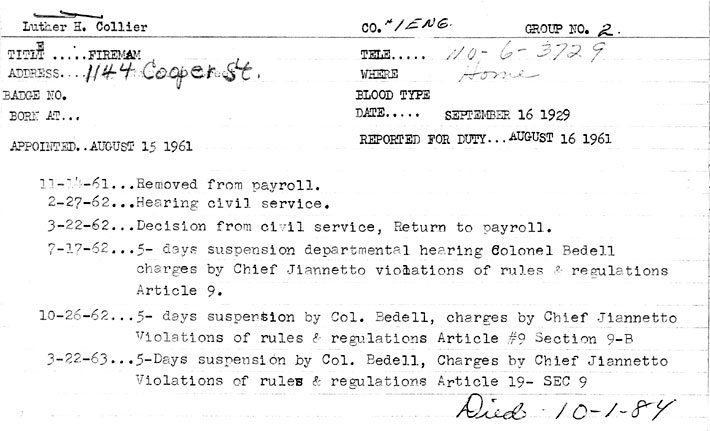 LUTHER H. COLLIER was born on September 16, 1929. He made his home at 1144 Cooper Street. Luther Collier was appointed to the Camden Fire Department on August 15, 1961 and assigned to Engine Company 1, reporting for duty at the Pine Street fire house the next day. Unfortunately, Luther Collier's tenure with the fire department were marked by disciplinary actions. Last a resident of Philadelphia PA, Luther Collier died on October 1, 1984. . |