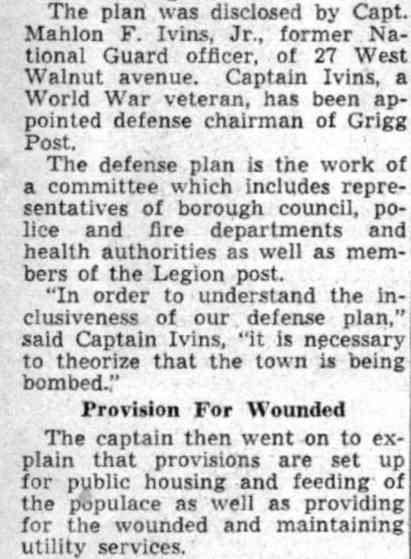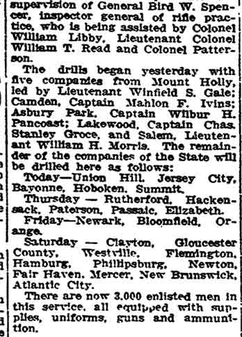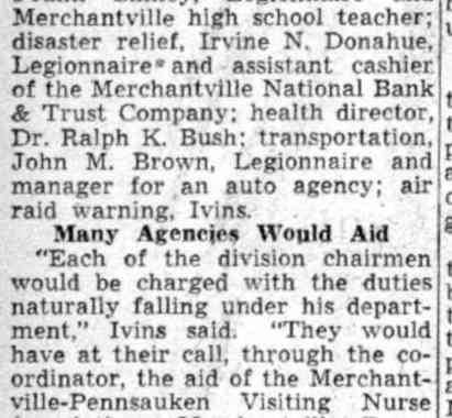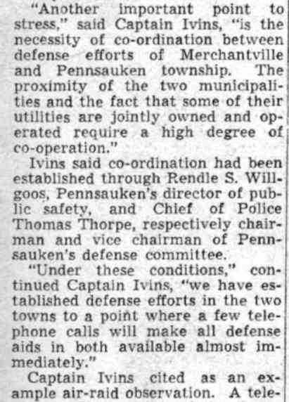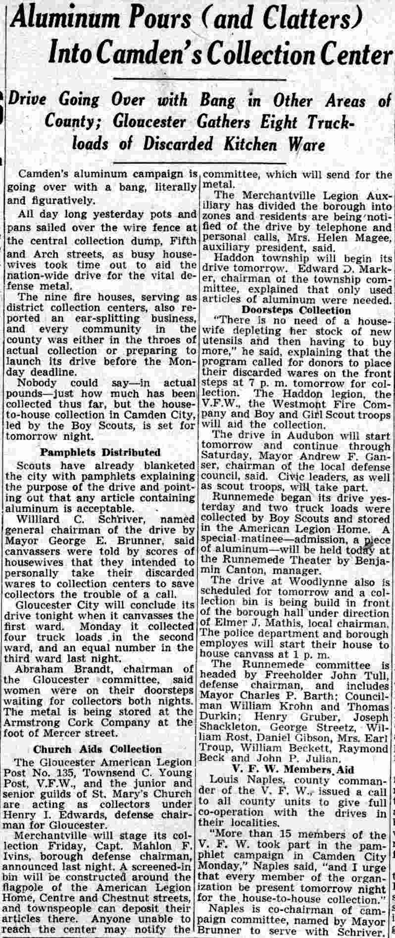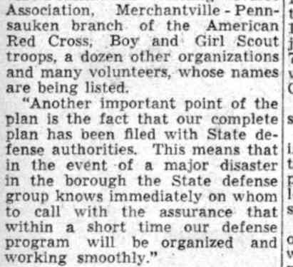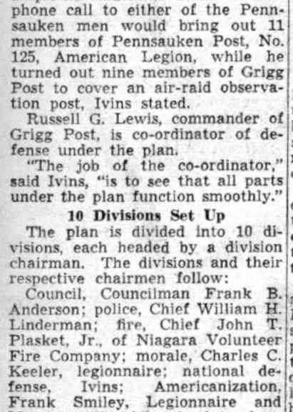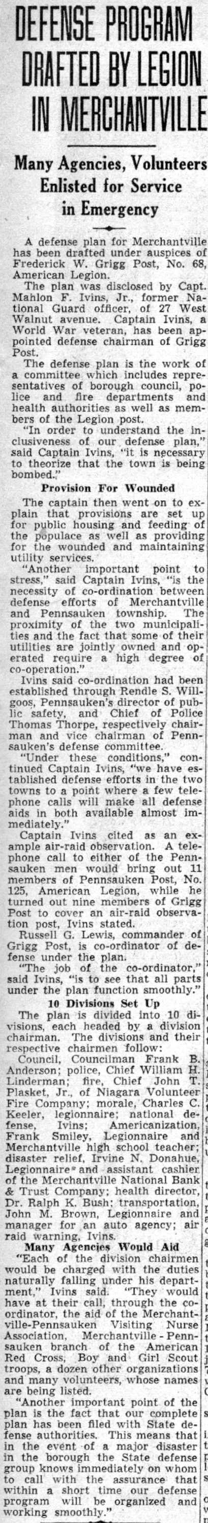 Vets in Colorful Memorial Crowd Convention Hall More than 2500 persons attended a joint veterans memorial observance in Convention Hall which followed a parade of veterans and civic organizations yesterday afternoon. To the martial strains of bands and bugle corps, the participants marched from Fifth and Cooper to Seventh Street; south to Haddon avenue, then to Line Street and the Convention Hall. The parade was headed by a squad of motorcycle police under Acting Sergeant William Taylor. They were followed by the band, headquarters, howitzer, medical and service companies of the 114th Infantry in command of Capt. Mahlon F. Ivins, Jr. Then came the massed colors, National Guard, Naval Reserve, Disabled American Veterans, John J. Pershing Camp No.9, United War Veterans, Gen. John A. Mather Post No. 18, Spanish War Veterans with their fife and drum corps and the Clara E. Waller Auxiliary; Posts 518 and 980 of the Veterans of Foreign Wars and their bugle corps; Mt. Ephraim Junior Legion, No. 150; and, bugle corps; Public Service American Legion Post and bugle corps; Westmont American Legion Post and bugle corps; 50 Pennsylvania Gold Star Mothers led by Mrs. Mary E. Hewson; Elks color guard and the Salvation Army and band. G. A. R. Vets In Line Three veterans of the G. A. R., in flag-draped automobiles, participated in the parade. They were John W. Coleman, 76, of 31 North Thirty-fifth street, who served with the 19th Pennsylvania Cavalry; William A. Morgan, 93, of Clementon, who was with the 104th Doylestown Infantry, and Leonard L. Roray, 89, of Glassboro, who served with Company H, Third New Jersey Cavalry. Ceremonies at Convention Hall opened with advance of the colors to the stage and invocation by Rabbi Nachmann Arnoff. Rev. Charles Bratten Du Bell, former chaplain of the 114th Infantry, delivered a memorial address, taking as his subject the career of General "Stonewall" Jackson. Congressman Charles A. Wolverton after paying tribute to the G. A. R., Spanish American and World War veterans, promised that Congress would make provisions to support widows and orphans of veterans who need aid before adjournment this Summer. Criticizes Veteran Cuts He attacked any plan for balancing the national budget which does so at the expense of the veterans. "There are two ways to balance the budget,'" he said. "One is to take the money from the veterans and federal employees. The other is to require wealth to help." American Legion, Veterans of Foreign Wars and United Spanish War Veterans memorial services and rituals also featured the program. Rev. Lewis A. Hayes, of Westmont, pronounced the benediction. C. Richard Allen, past county commander of the American Legion, was master of ceremonies. The committee included Samuel Magill, Jr., chairman; Edward A. Stark, A. F. Klein, Joseph A. Kohler, Joseph Whylings, James J. Burke, Norval McHenry, Charles Buzine, William Amberg, James Milne, William P. Breen, William Miller, William Reinholdt; Edward J. Wintering, William Eisele, William Lloyd, Joseph F. Markley, Frank Ellis, D. J. Connors, Joseph Lounsberry and Charles M. Jefferies. . |