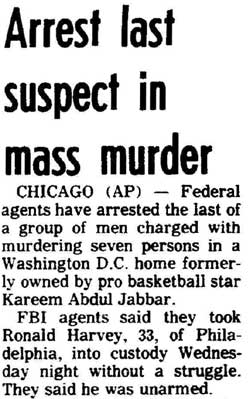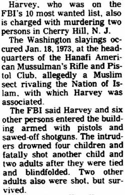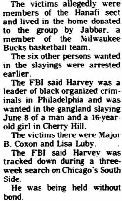 An African-American, Major Benjamin Coxson was a flamboyant underworld figureāa car thief, a gangland fixer and a candidate for the mayor of Camden. Underworld sources claim the Muslims ordered Coxson killed for failing to broker a major heroin deal between the New York Mafia and the local Muslim mob. He was murdered by Philadelphia's Muslim mob along with his companion Louise Luby, and her daughter, Lita, at his home in Cherry Hill NJ on June 8, 1973. Philadelphia crime figure Ronald Harvey, who was convicted of the Nation of Islam-ordered murder of two women and five children in Washington DC in January of 1973, is suspected of carrying out the murder of Major Coxon and the Lubys. Harvey was never charged with the crime however, and died in prison. |