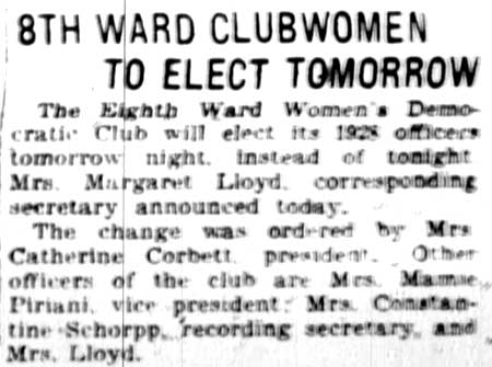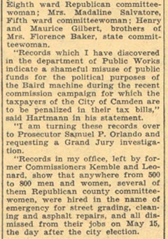 MAMIE PIRAINE was the Republican county committeewoman from Camden's 8th Ward in the early 1930s. At the time of the May 1934 primary she had held that post for three years. Mamie F. Piraine appears to have been born Philomena Pisseco in 1885 in Pennsylvania, of Italian parents. At 18 she married Constantino Piraine, a bricklayer who had been born in Italy. By 1910 there were two daughters, Elizabeth and Marie. The Pisseco family was living in the 600 block of Ferry Avenue as early as 1906. Constantino and Mamie Piraine were living in Camden when the 1914 City Directory was compiled, at 650 Ferry Avenue. Constantino Piraine was then working as a stone mason. By 1918, at 676 Ferry Avenue, Constantino Piriane was running a small movie theater. The Piraines were still at that address in January of 1920. Also there were mamie's two brothers Thomas and Charles Pisseco. The Piraine family was still on Ferry Avenue as late as 1924. The Piraines lived at 2006Broadway in the early 1930s. The 1930 census shows the Piraine family there, which by then included daughters Marie R. and Elizabeth. Constantino and Mamie Piraine ran the bar at 1944 Broadway into the mid-1930s. It appears that Constantino Piraine passed away in the mid-1930s. 1944 Broadway became the home of American Legion Post 274 in 1939, and was until 2008. By 1947 Mamie F. Piraine was a widow, and was staying at 1297 Sayrs Avenue with daughter Elizabeth. She later moved to an apartment at 9 Willow Walk, in the Morgan Village section of Camden, where she was living in 1959. |