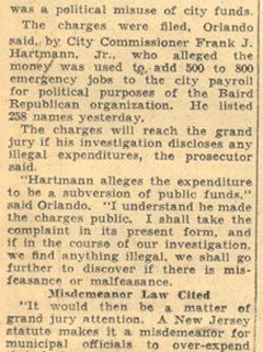 JURY CLEARS NUMBER SUSPECTS Two men alleged by city and county authorities to have succeeded the Klosterman brother sin controlling the Camden numbers racket last Spring, were exonerated by the Camden county grand jury. Those whose cases were “no billed” are Chester “Gassy” Szalinski, 30, of 1188 Chestnut Street, and Joseph Putek, 29, of 2955 Tuckahoe Road. At the same time, the grand jury in its report to the County Clerk Charles S. Wise, failed to find an indictment against Robert Bloodworth, another suspect arrested in connection with the operation of lotteries in Camden. After the trial of the Klosterman brothers, Fred and Joe, both of whom were convicted last spring of number charges, Szalinski was named by Police Chief Arthur Colsey as the “Sixty-ninth Street mobster who had taken over the Klosterman numbers play.” Every policeman in Camden was ordered to arrest Szalinski on sight. The suspected numbers operator was arrested and later released in $1500 bail to await the action of the grand jury. Putek was arrested lat April after police had engaged in a sensational chase of 15 blocks after a suspected numbers pickup automobile at which they fired a number of shots, pone of which struck a bystander. Police allege putek joined szalinski in control of the Klosterman numbers game. Arrests of both men climaxed orders to county police authorities by Supreme Court Justice Frank T. Lloyd and Prosecutor Samuel P. Orlando to clean up the number racket in this area. “No bills” were returned by the grand jury for Harry Hartman and John Burke charged with attempts and breaking and entry; J.G. Flynn, accused of being a fugitive from justice from Philadelphia; Ralph Latshaw, Anna Green, and Theodore Jones, statutory charges. Hartman and Burke were held for the grand jury last month on charges they attempted to enter the saloon of Mrs. Mamie Piraine, Republican county committeewoman from the Eighth Ward, at 1944 Broadway. |