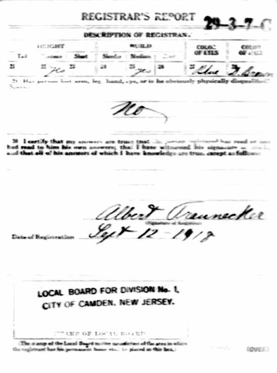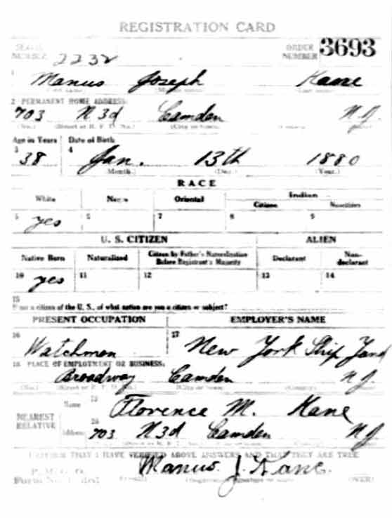 MANUEL KANE was born in Pennsylvania around 1883. He came to Camden with his wife and children sometime after 1914. By September of 1918 he was living at 703 North 3rd Street with his wife Florence, daughter Elva and son Earl. When he registered for the draft he was employed as a watchman at the New York Shipbuilding Corporation shipyard. He was employed at a chemical factory when the 1920 Census was taken. By 1924 he had been appointed to the Camden Fire Department. Manuel Kane was still a member of the Department and still residing at 703 North 3rd Street when the 1931 Camden City Directory was compiled. By 1940 Manuel and Florence Kane had moved to 1223 North 20th Street in Cramer Hill. He passed away on April 11, 1942 and was buried in Oakland Cemetery in the Frankford section of Philadelphia, Pennsylvania. Florence Kane was still living at the Cramer Hill address as late as 1947. |