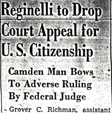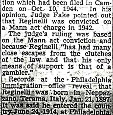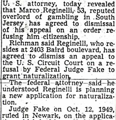 Reginelli Wiretap evidence against Philadelphia mobs is being examined by immigration agents in an effort to strip Marco Reginelli, South Jersey gambling czar, of his citizenship. The investigation was revealed when Samuel Horowitz, of the Bureau of Immigration and Naturalization legal staff, conferred with District Attorney Samuel Dash and police officials in Philadelphia. Immigration officials expect hundreds of reels of tape-recorded telephone conversations obtained by Philadelphia police will provide evidence linking Reginelli to racket mobs in Philadelphia, it was learned. Such evidence would be used in the Government's fight against the citizenship granted to Reginelli on June 21 by the Atlantic County Court. Reginelli was granted citizenship in Atlantic County, which has no Federal court, after three Federal courts elsewhere had refused him citizenship. The citizenship conferred by the county court was subject to a Federal examiner's approval. Before Reginelli was sworn as a citizen he faced deportation to his native Italy as an undesirable. |
