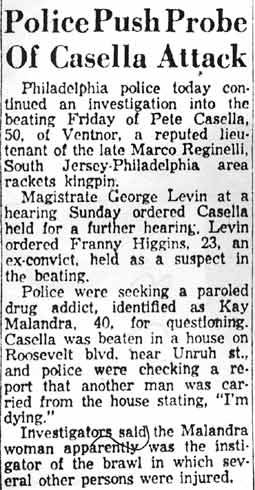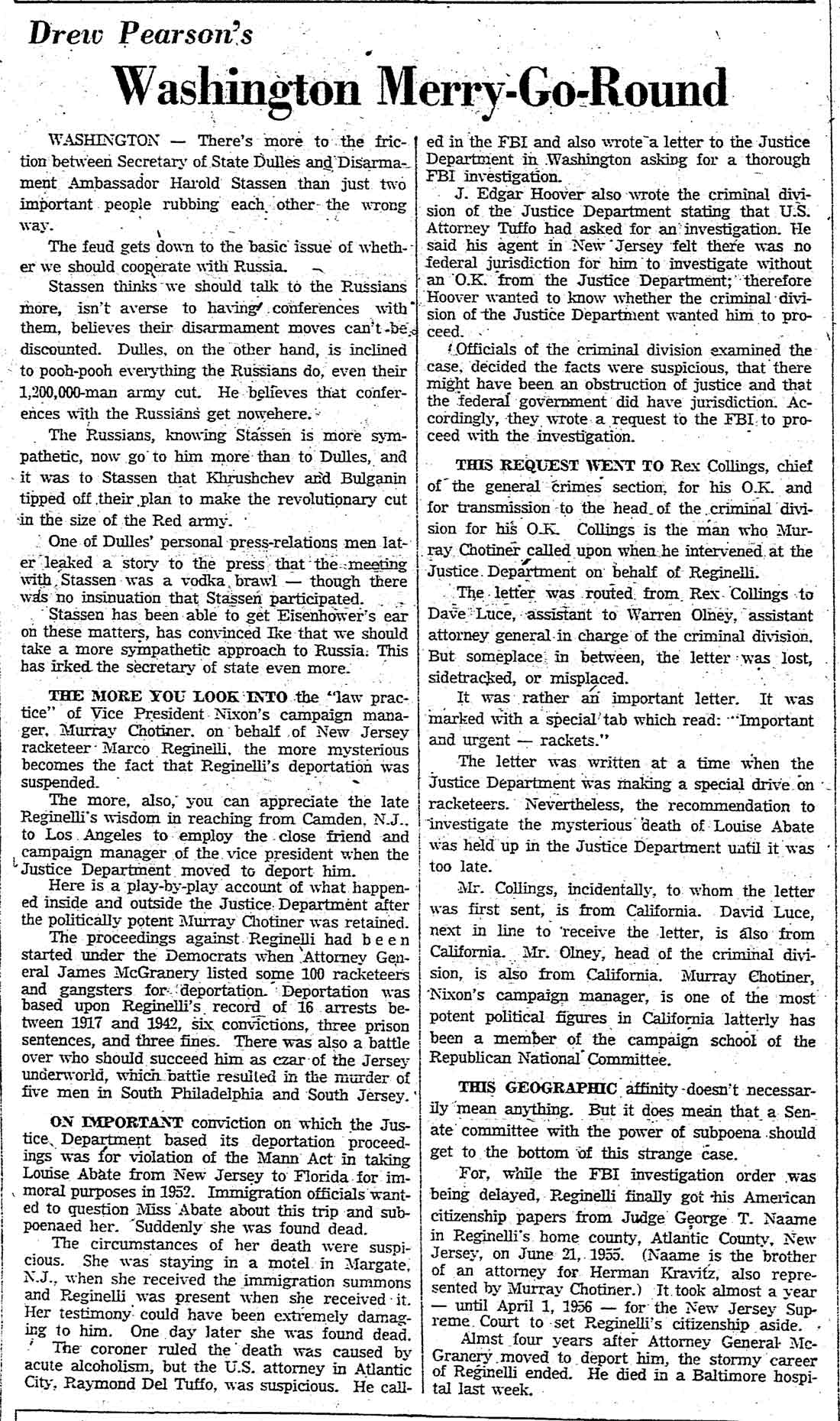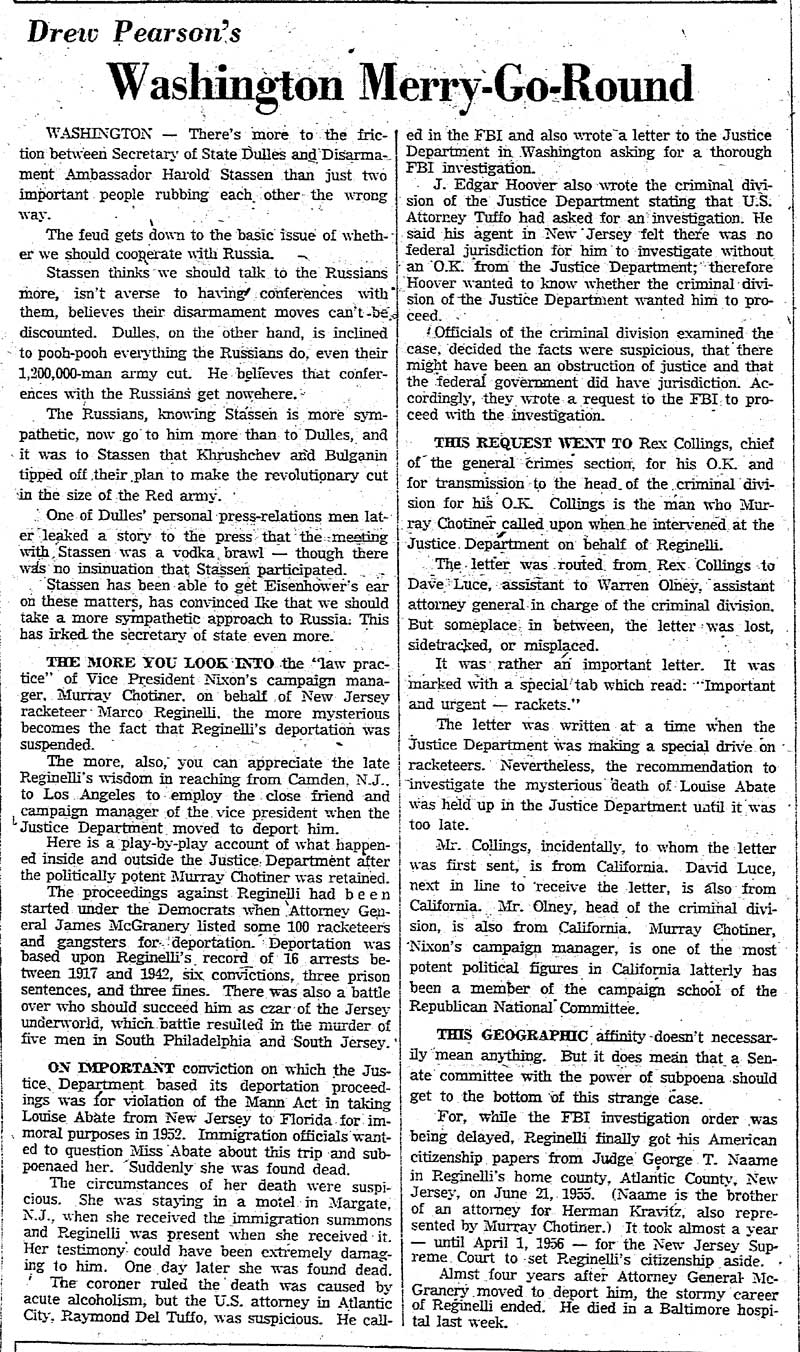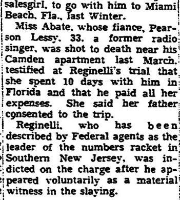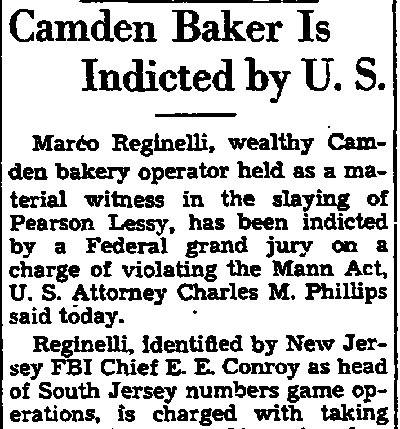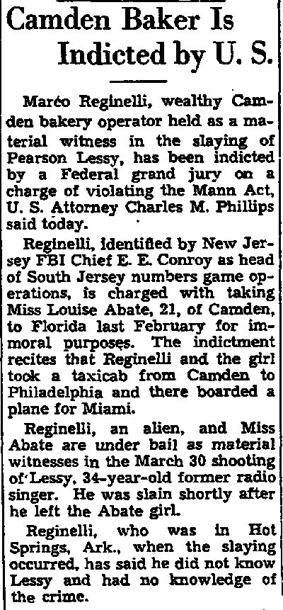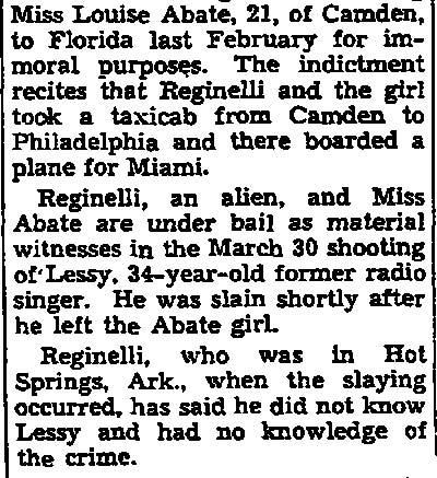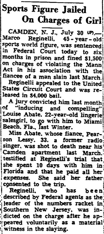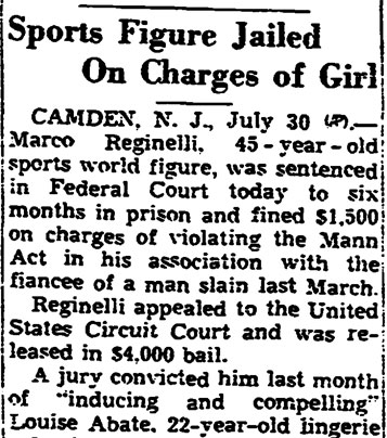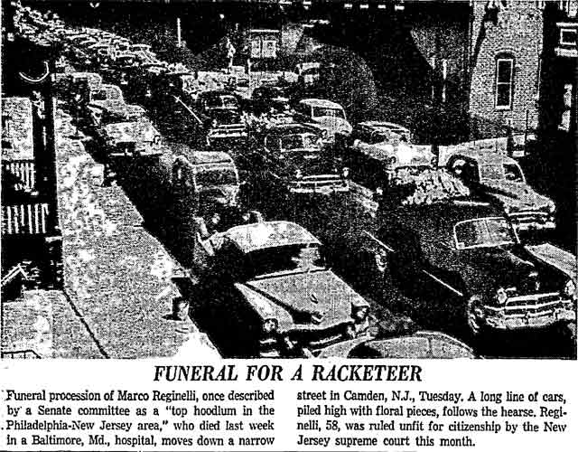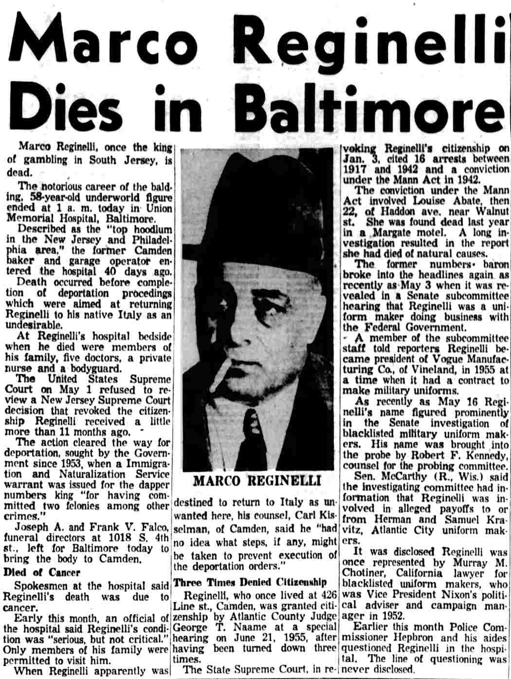Top Hoodlum Dies in Baltimore Hospital BALTIMORE, May 25 - Marco Reginelli, once described at a congressional committee hearing as "the top hoodlum of the Philadelphia-New Jersey area," died today in Union Memorial Hospital. He was 58. Reginelli's name was brought up in a Senate Investigations Subcommittee hearing on charges of corruption in handling government contracts for making uniforms. Robert F. Kennedy, committee counsel, called Reginelli a "hoodlum" and said he had been arrested 16 times, convicted 6 times and was "involved in three murders". The Italian born Reginelli achieved citizenship but it was revoked after the New Jersey Supreme Court ruled he had "failed to prove good moral character as required." Reginelli was, last arrested in 1942 when he was convicted of transporting a woman from New Jersey to Florida for immoral purposes. The woman, Miss Louise Abate, was found dead in a Margate, N.J. motel and Reginelli was questioned. It was later ruled she died of natural causes. Reginelli was a Margate resident. Reginelli's previous convictions were for fraudulent conversion, larceny, receiving stolen goods, conspiracy to steal and a violation of the Mann Act. His chief physician, Dr. Howard Chandler Smith, a urologist, would not discuss the nature of Reginelli's illness. |