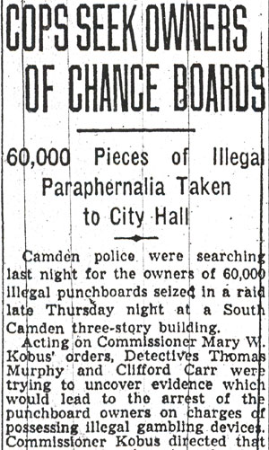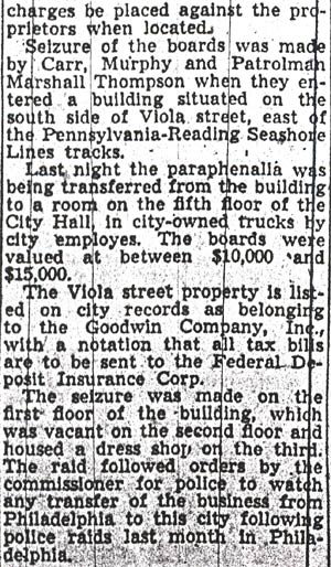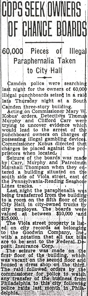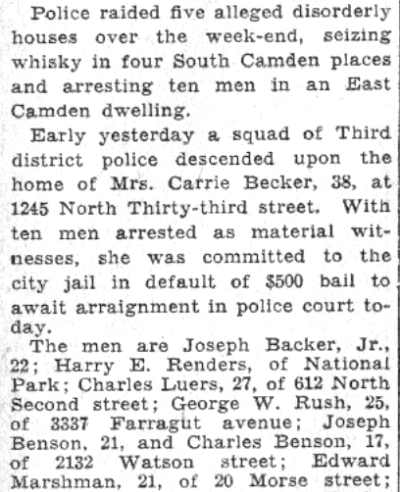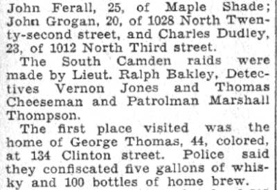 RODGERS IS GIVEN 180 DAYS James "Jimmy" Rodgers, 28-year-old former boxer who on numerous occasions has run afoul of the law, was sentenced yesterday to serve 180 days in the county jail for operating a speakeasy at 1000 Segal Street. In addition, he was held without bail by Police Judge Pancoast on a charge of possession of stolen goods. The goods were identified by their owner, James Greer, 35, of 332 North Second Street, who was in the speakeasy when police raided it Monday night. Greer turned state's evidence against Rodgers in police court yesterday, and for a reward, received a suspended sentence. District Detective harry kyler, Marshall Thompson and Walter Smith raided the speakeasy and confiscated 65 pints of whisky in bottles and a gallon of whisky in a jug. Kyler testified Rodgers was not there when the raiders entered the place but appeared later and was arrested. 3 Others Nabbed Three others were arrested in the place. These were Greer, Thomas Spencer, 33, who gave the speakeasy as his home address, and John D. Wood, 35, of 928 Kimber Street. Spencer has been arrested approximately 75 times, the police said. The detectives, when searching the premises, found a suitcase filled with shoestrings, collar buttons and other merchandise. Greer identified the case and its contents as having been stolen from his car when it was parked on Segal Street near Front some time ago. He lodged the complaint of possession of stolen goods against Rodgers. Rodgers was arraigned on three charges, including the stolen goods count. The other complaints were that he sold beer without a license and violated Section 422 of the city ordinances which prohibits disorderly persons to congregate on the premises. Rodgers pleaded not guilty on all three charges, and told the court he had "nothing to say." He was fined $200 on each of the charges of violating Section 422, and selling without a license, and when he did not pay, he was sentenced to 90 days on each of the two counts. He was committed to the county jail without bail on Greer's complaint of possession of stolen goods. Greer testified that he had purchased liquor in Rodgers' place several times, as late as last night. Greer's sentence was suspended. Spencer Refuses to Talk Spencer refused to testify against Rodgers. He said he did not know l "what was going on there" and that he was there painting. "You won't be painting there for 90 days," retorted the court in pronouncing sentence. Wood, the other man arrested in the place, did not appear in court and forfeited $10 security he had posted after the raid. Rodgers has been arrested several times for operating speakeasies. He was also arrested as a material witness two years ago in the murder of William "Shooey" Bonner." Spencer was arrested so often when he resided in Gloucester that he became known as "Gloucester's Peck's Bad Boy," the police said. Since moving to Camden he has been arrested arrested nearly 50 times, police stated. The majority of his arrests have been on charges of drunkenness and disorderly conduct, but in 1925 and in 1926, he was arrested on a charge of larceny of automobile. Again in 1929 he was charged with non support, when he was ordered to pay his wife $10 weekly. Back In 1916 he was arrested on a charge of stealing a gold watch. |