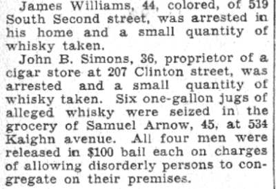 RAID James "Jimmy" Rodgers, 28, former boxer; fell into the hands of police again last night when they raided a speakeasy at 1000 Segal Street, allegedly operated by him. One gallon of whisky and 65 pint bottles were confiscated by the raiders, who were led by District Detectives Walter Smith, Marshall Thompson and Harry Kyler. Three others were arrested. One of them, James Greer, 35, of 332 North Second street, placed a charge of possession of stolen goods against Rodgers when police unearthed some articles stolen from Greer two months ago. Others arrested were Thomas Spencer, 33, of the Segal Street address, and John D. Wood, 35, of 928 Kimber Street. Rodgers has fallen afoul of the , law on numerous occasions. He has been arrested several times for operating speakeasies. He was also arrested as a material witness in the "Shooey" Bonner murder two years ago. He will be given a police court hearing today, Detectives raided a vacant dwelling at 225 Chestnut Street last night and seized a "moonshine" plant consisting of two stills, 36 barrels of mash and oil and gas stove cookers. The place had been under observation by Detective Vernon Jones for two weeks. No one was inside when Jones and Patrolmen George Hemphill and John Houston entered. A 50 gallon still was on the second floor and a 35 gallon still on the first floor. |