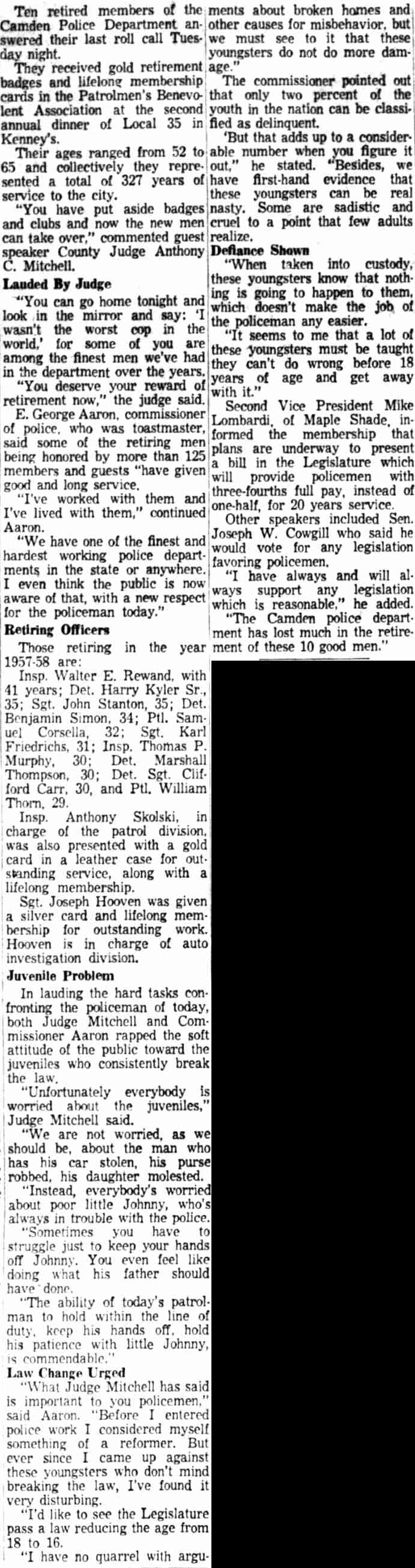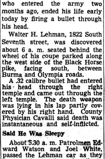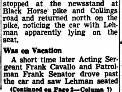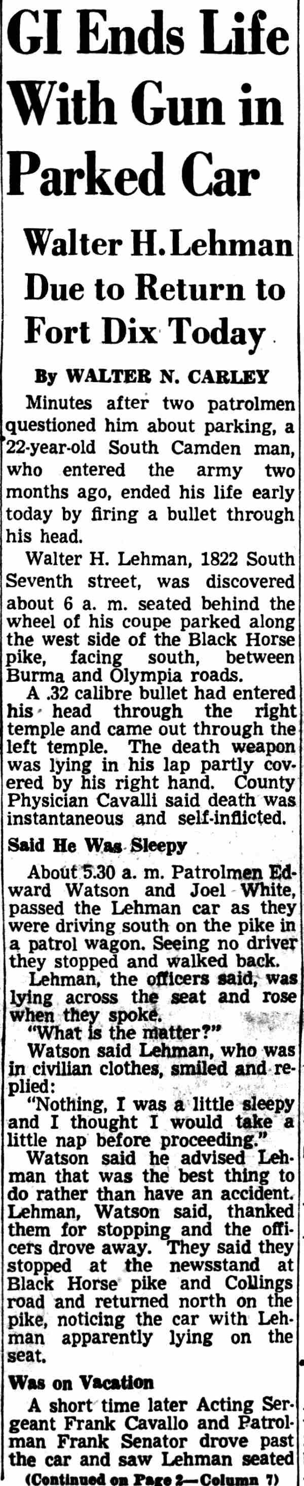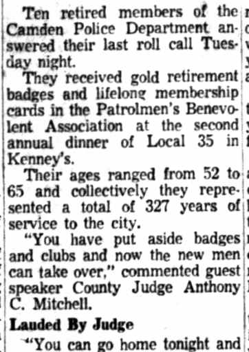 MARSHALL THOMPSON was born in New Jersey around 1906 to a family that had a long history in the city. His father, George Robeson Thompson, was justice of the peace, and his grandfather, John Reeve Thompson, was a member of Camden's first City Council. He was one of at least 7 children born to the Thompsons. The family lived at 1113 South 4th Street when the Census was taken in 1910. By January of 1920 they had moved to 325 Walnut Street. Marshall Thompson married at the age of 21, and his wife, the former Emma Holloway, bore a daughter, Caroline, around 1928. On March 1, 1928 Marshall Thompson was appointed to the Camden Police Department along with the following men, Francis Guetherman, August Riehm, William Schriver, edward shapiro, John V. Wilkie, Earl Wright, Edward Cahill, Walter Vecander, Stanley Bobiak, Paul Edwards, Leon Feltz, George Getley, Joseph Lack, Thomas Stanton, Otto Toperzer, and Frank Wilmot. Vecander's younger brother Harold Vecander joined the force on September 20, 1940. Both brothers were still on the force in January of 1949. At the time of his appointment to the police force, Marshall Thompson and his family were renting a home at 943 North 32nd Street in Camden's Cramer Hill neighborhood. His parents had also moved to Cramer Hill, living at 900 Beideman Avenue. In 1936 Officer Thompson was often partnered with Sergeant Nathan Petit. Camden Courier-Post columnist Dan McConnell, wrote this about Officer Thompson in his November 3, 1939 column: "Marshall Thompson, one of Camden's finest, is a talented pianist. he never took a music lesson." Officer Thompson had been taught to play by his mother, Harriette Thompson Marshall Thompson had been promoted to Detective by 1947. He then lived at 126 North 32nd Street in East Camden. He was still working as a detective with the Camden Police department as late as December of 1957. He retired from the Camden Police Department on a police pension sometime prior to 1967. |